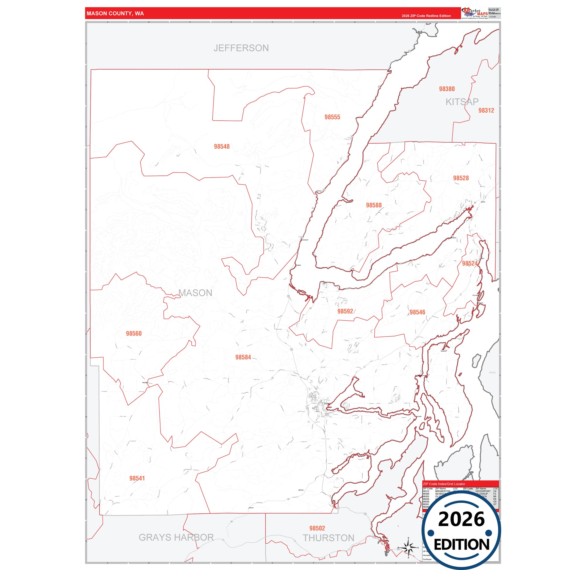 The RedLine Style map of Mason County, WA shows ZIP code areas overlaid on a detailed road network of Mason County, Washington. Ideal for drawing locations, territories, and other applications. Base map features include all major streets and highways labeled, cities and towns, county and state boundaries, neighborhood names, railroads, and a clean white background suitable for marking and planning.