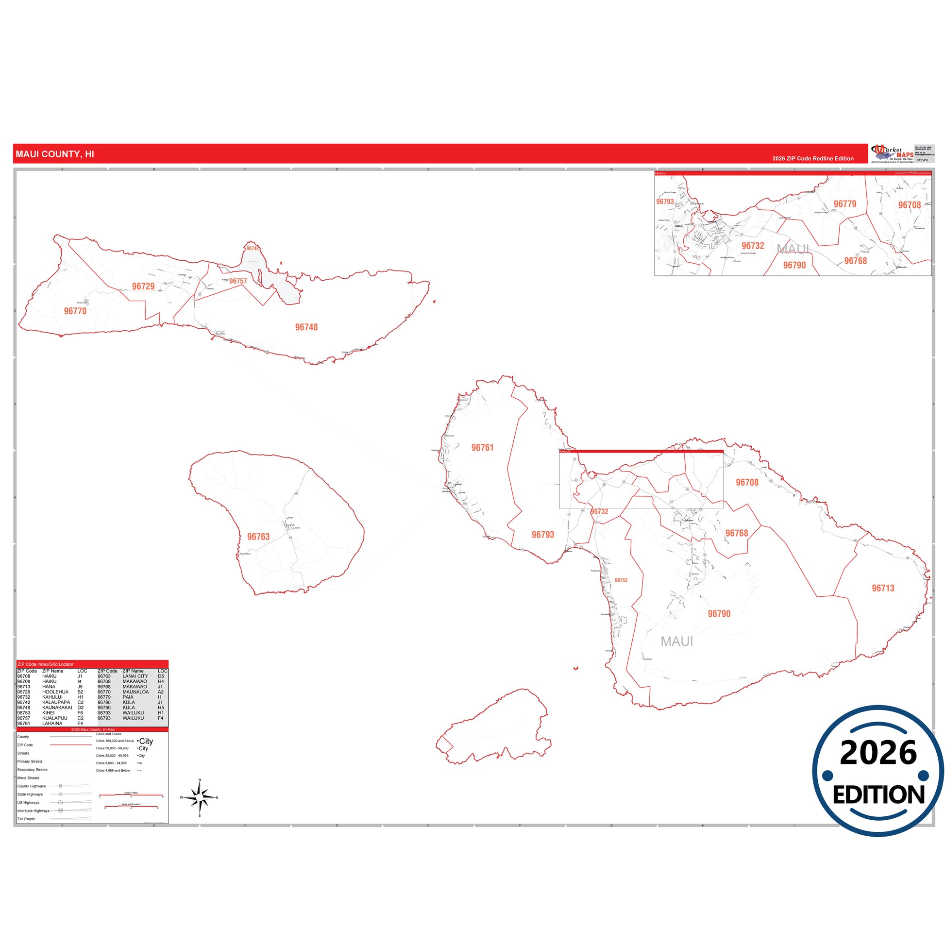 The RedLine Style map of Maui County, HI shows ZIP code areas overlaid on a detailed road network of Maui County, Hawaii. Ideal for drawing locations, territories, and other applications. Base map features include all major streets and highways labeled, cities and towns, county and state boundaries, neighborhood names, railroads, and a clean white background suitable for marking and planning.