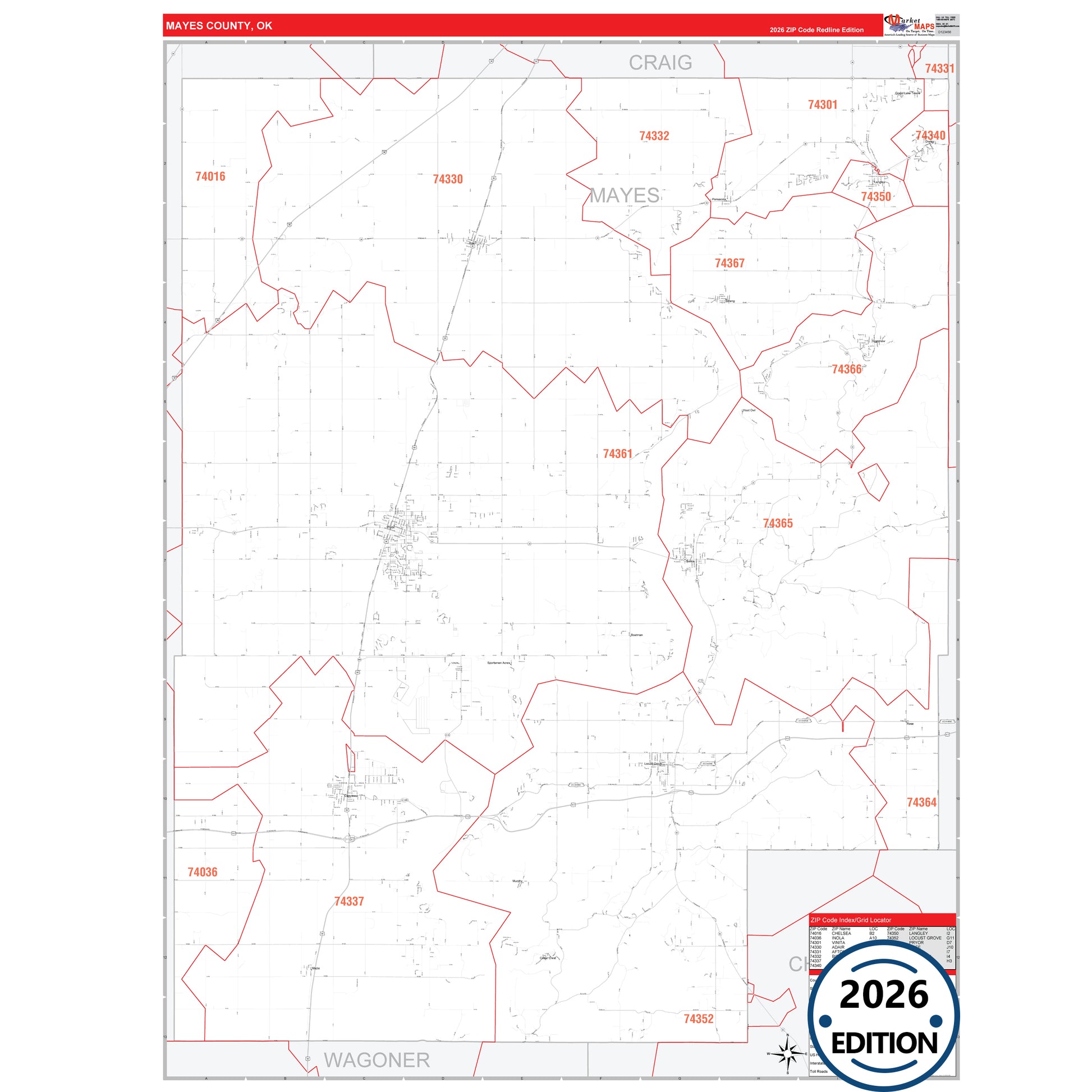 The RedLine Style map of Mayes County, OK shows ZIP code areas overlaid on a detailed road network of Mayes County, Oklahoma. Ideal for drawing locations, territories, and other applications. Base map features include all major streets and highways labeled, cities and towns, county and state boundaries, neighborhood names, railroads, and a clean white background suitable for marking and planning.