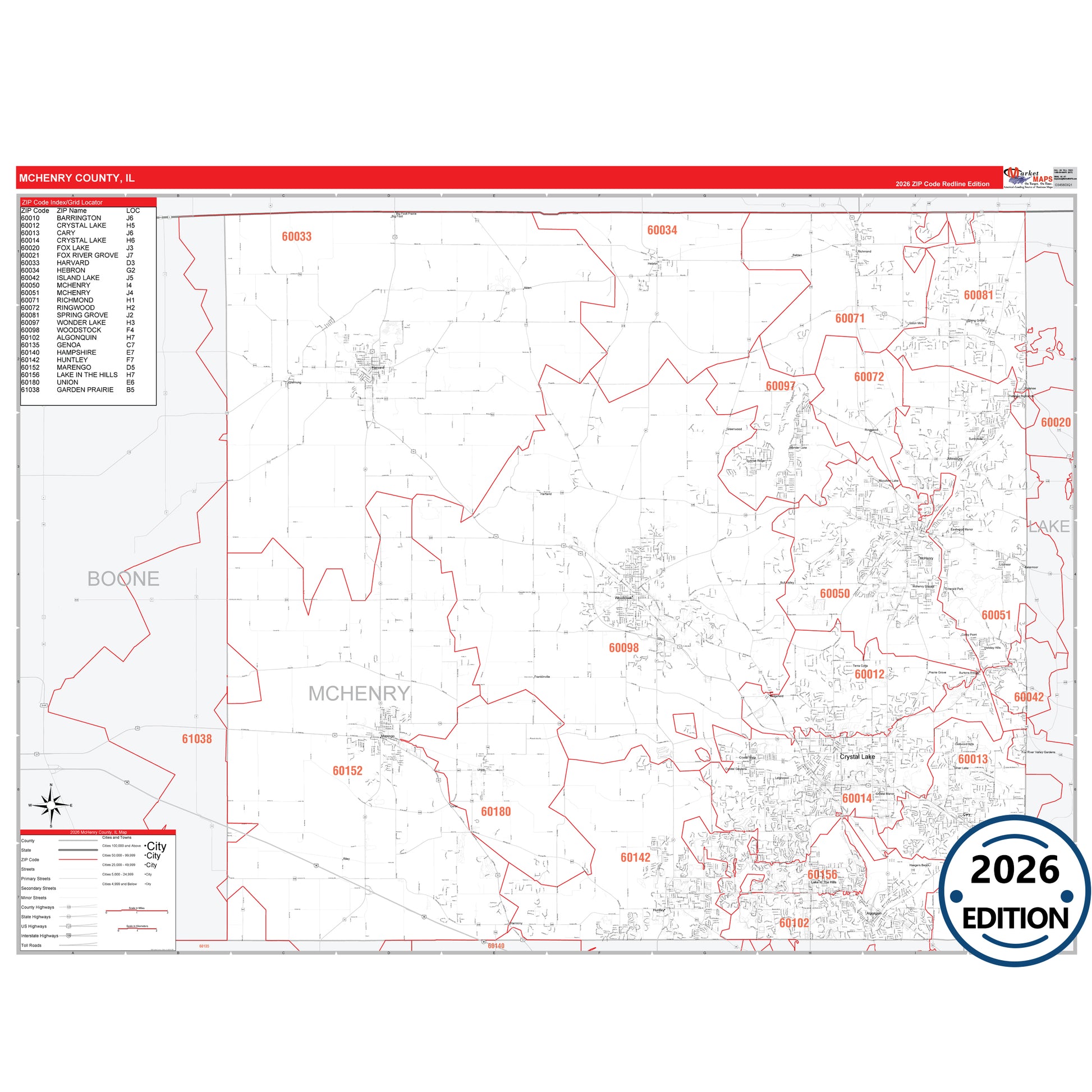 The RedLine Style map of McHenry County, IL shows ZIP code areas overlaid on a detailed road network of McHenry County, Illinois. Ideal for drawing locations, territories, and other applications. Base map features include all major streets and highways labeled, cities and towns, county and state boundaries, neighborhood names, railroads, and a clean white background suitable for marking and planning.
