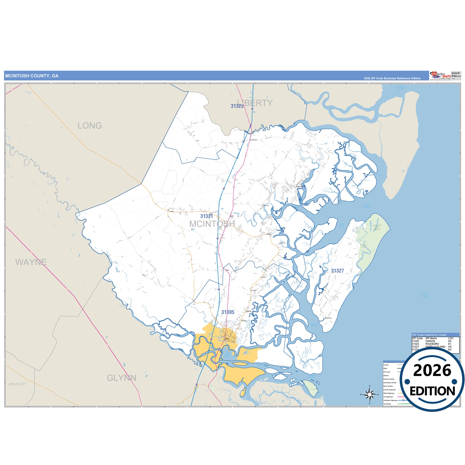 The Business Reference Style McIntosh County, GA is a detailed map that includes all towns, cities, major roadways, and highways. Available in multiple wall map sizes, perfect for home, school, office, or business display.