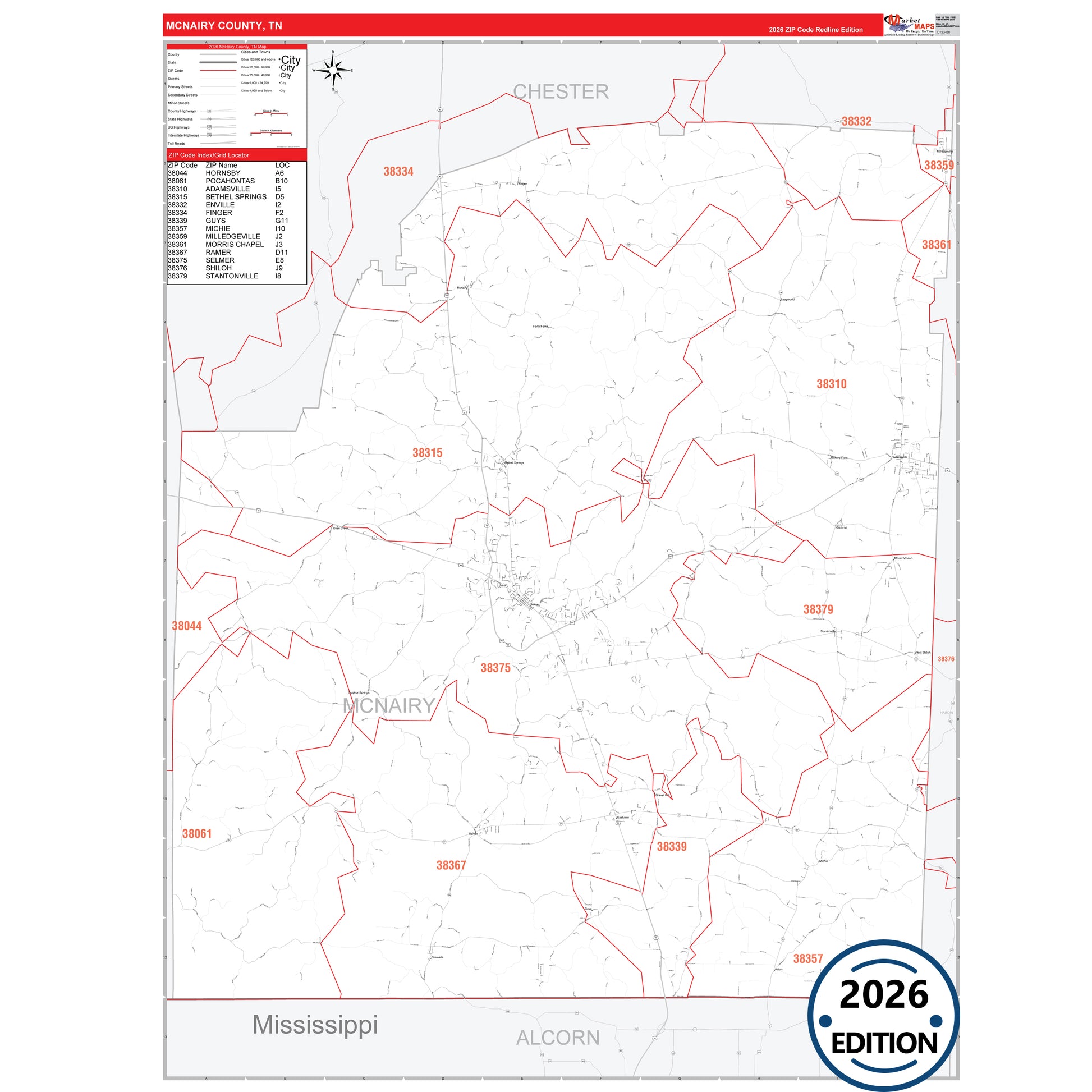 The RedLine Style map of McNairy County, TN shows ZIP code areas overlaid on a detailed road network of McNairy County, Tennessee. Ideal for drawing locations, territories, and other applications. Base map features include all major streets and highways labeled, cities and towns, county and state boundaries, neighborhood names, railroads, and a clean white background suitable for marking and planning.