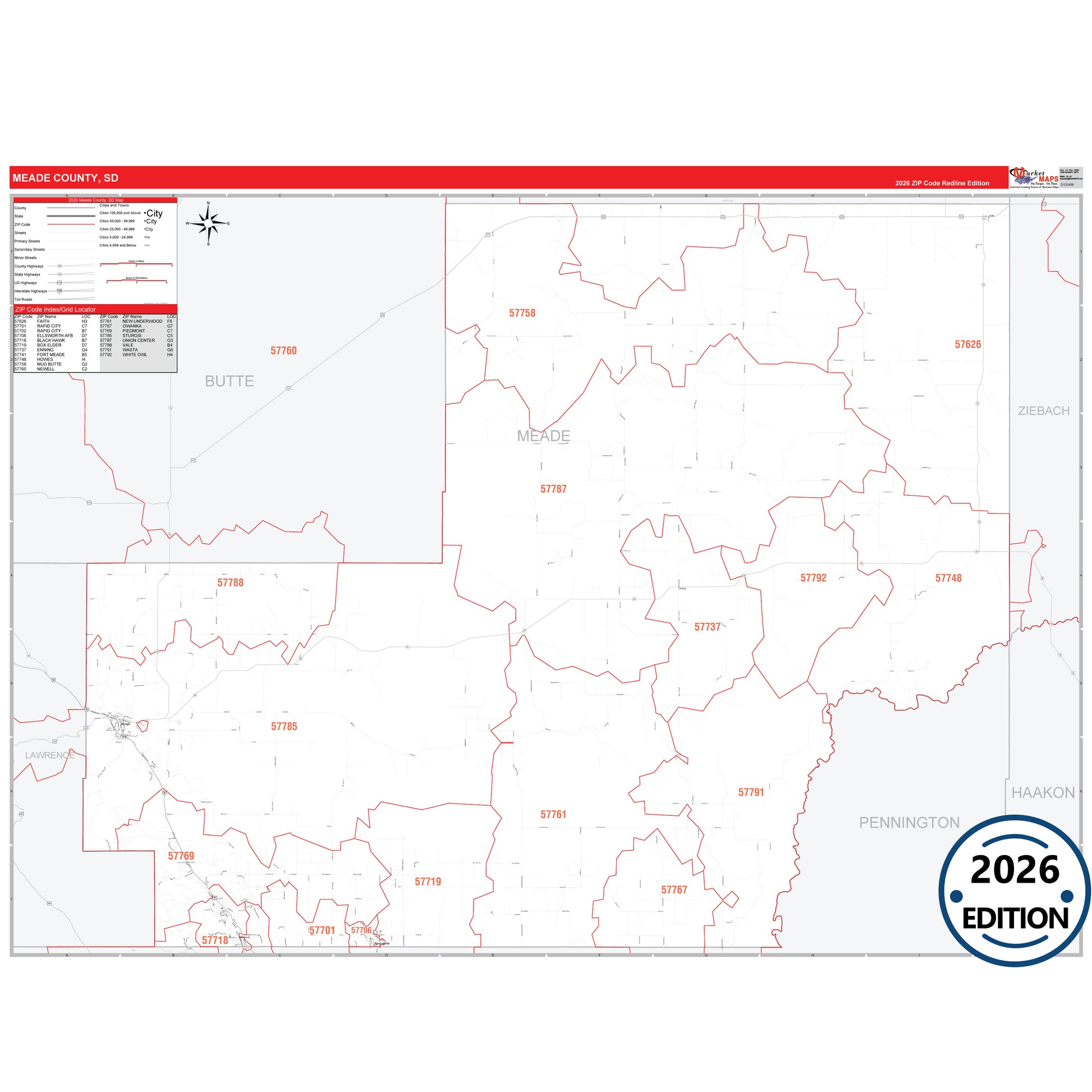 The RedLine Style map of Meade County, SD shows ZIP code areas overlaid on a detailed road network of Meade County, South Dakota. Ideal for drawing locations, territories, and other applications. Base map features include all major streets and highways labeled, cities and towns, county and state boundaries, neighborhood names, railroads, and a clean white background suitable for marking and planning.
