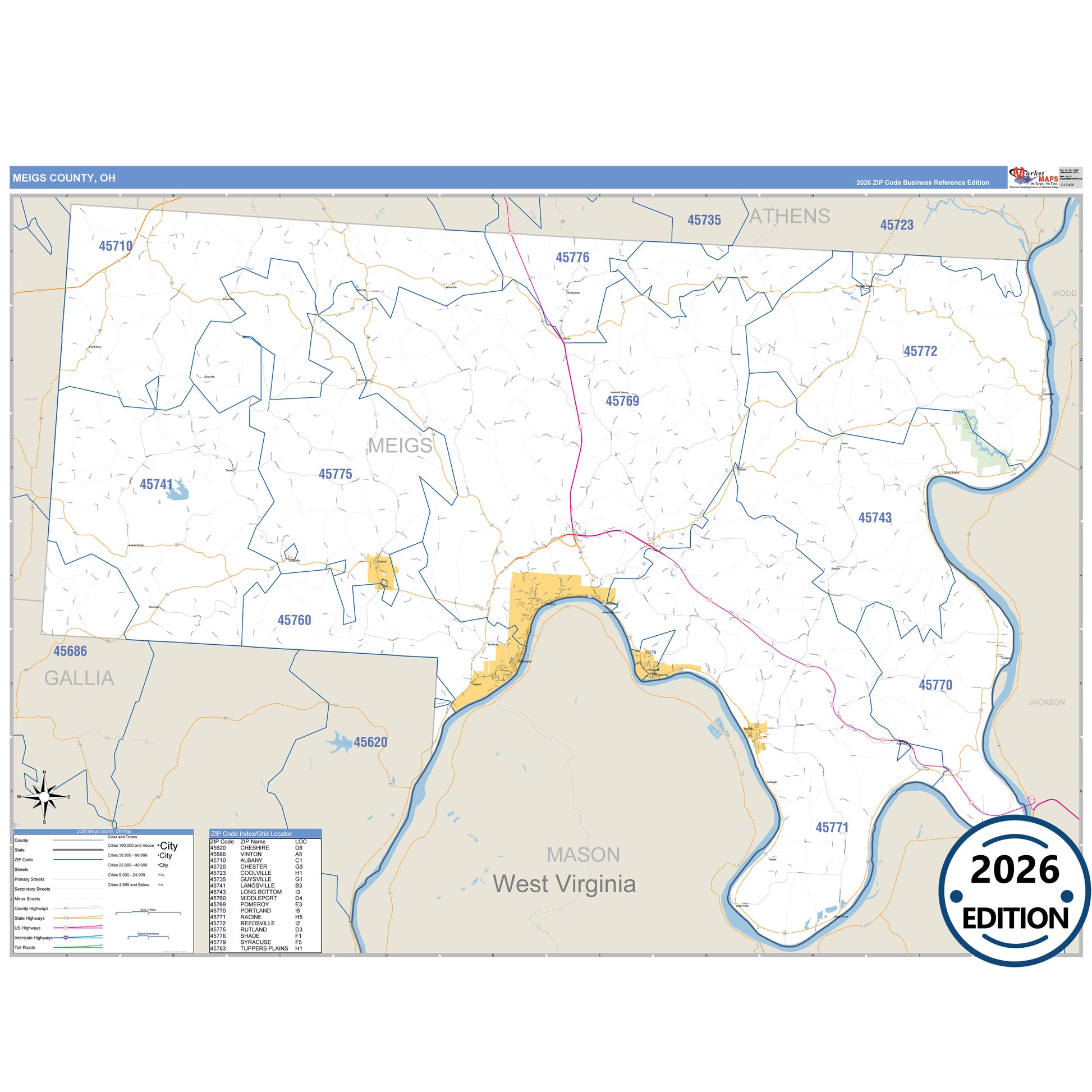 The Business Reference Style Meigs County, OH is a detailed map that includes all towns, cities, major roadways, and highways. Available in multiple wall map sizes, perfect for home, school, office, or business display.
