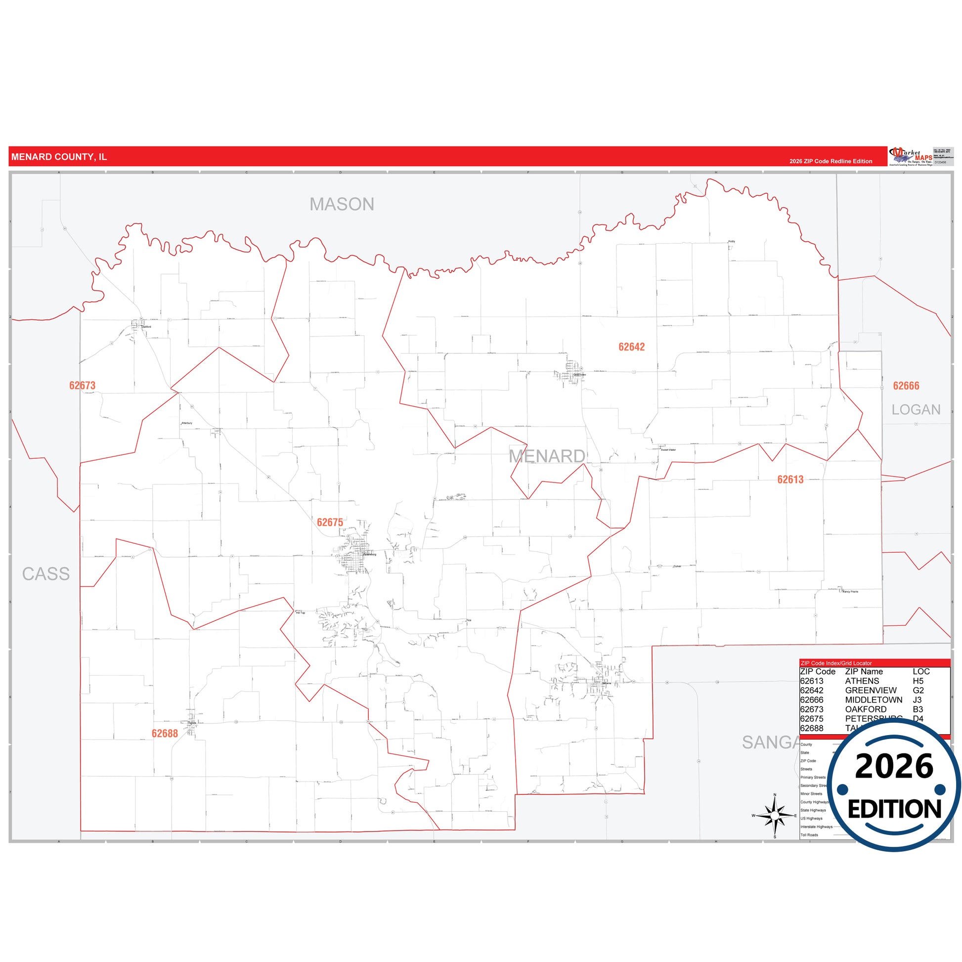 The RedLine Style map of Menard County, IL shows ZIP code areas overlaid on a detailed road network of Menard County, Illinois. Ideal for drawing locations, territories, and other applications. Base map features include all major streets and highways labeled, cities and towns, county and state boundaries, neighborhood names, railroads, and a clean white background suitable for marking and planning.