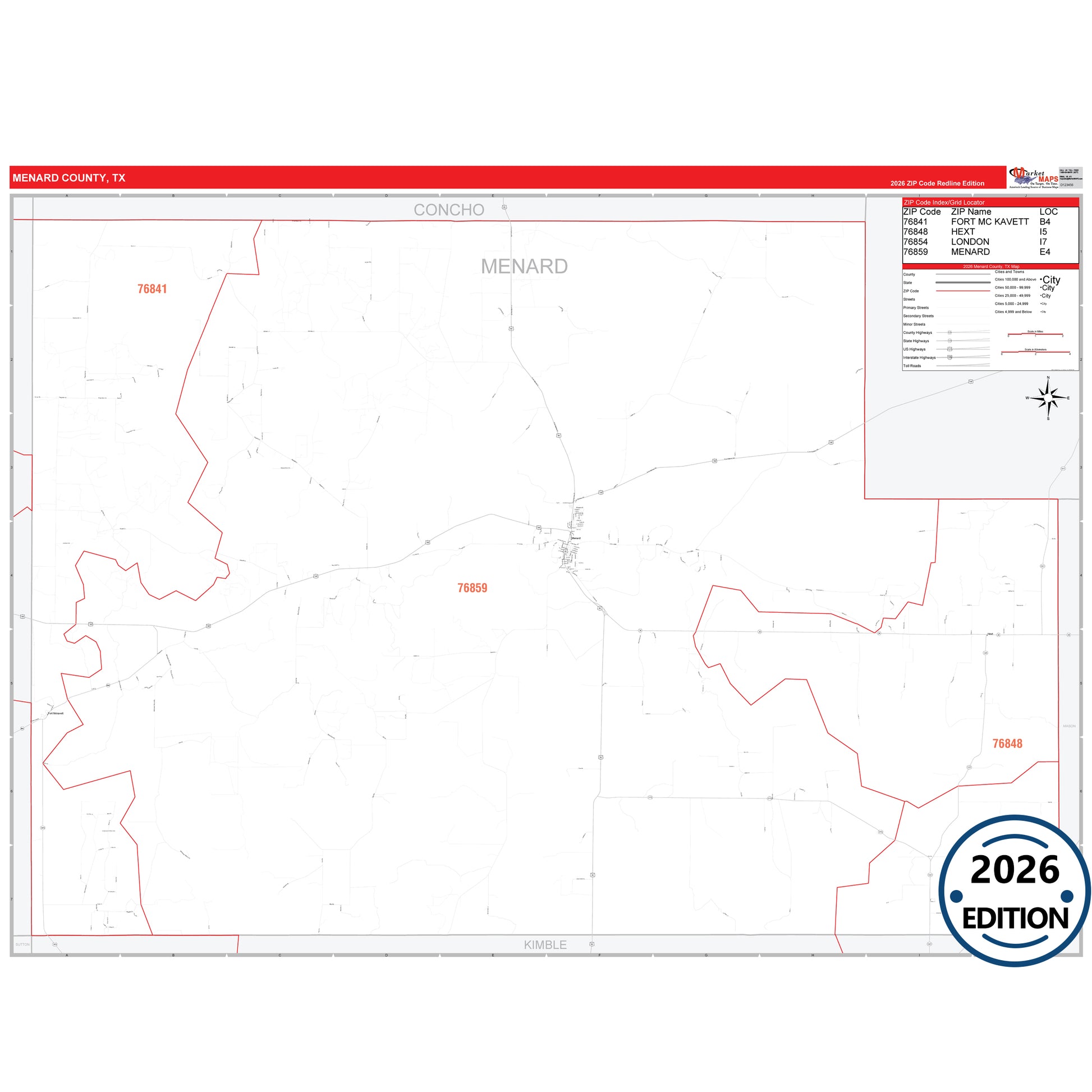 The RedLine Style map of Menard County, TX shows ZIP code areas overlaid on a detailed road network of Menard County, Texas. Ideal for drawing locations, territories, and other applications. Base map features include all major streets and highways labeled, cities and towns, county and state boundaries, neighborhood names, railroads, and a clean white background suitable for marking and planning.