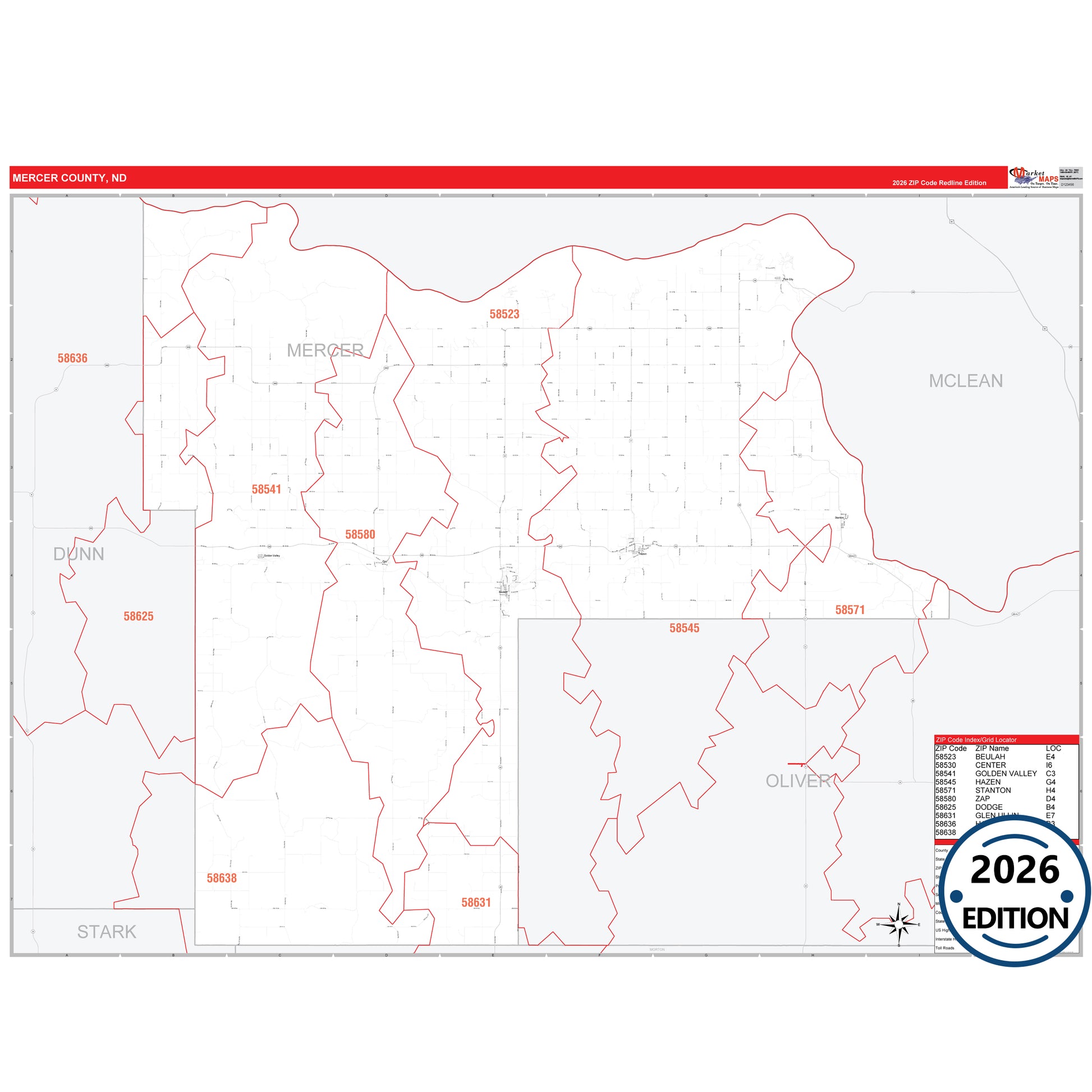 The RedLine Style map of Mercer County, ND shows ZIP code areas overlaid on a detailed road network of Mercer County, North Dakota. Ideal for drawing locations, territories, and other applications. Base map features include all major streets and highways labeled, cities and towns, county and state boundaries, neighborhood names, railroads, and a clean white background suitable for marking and planning.