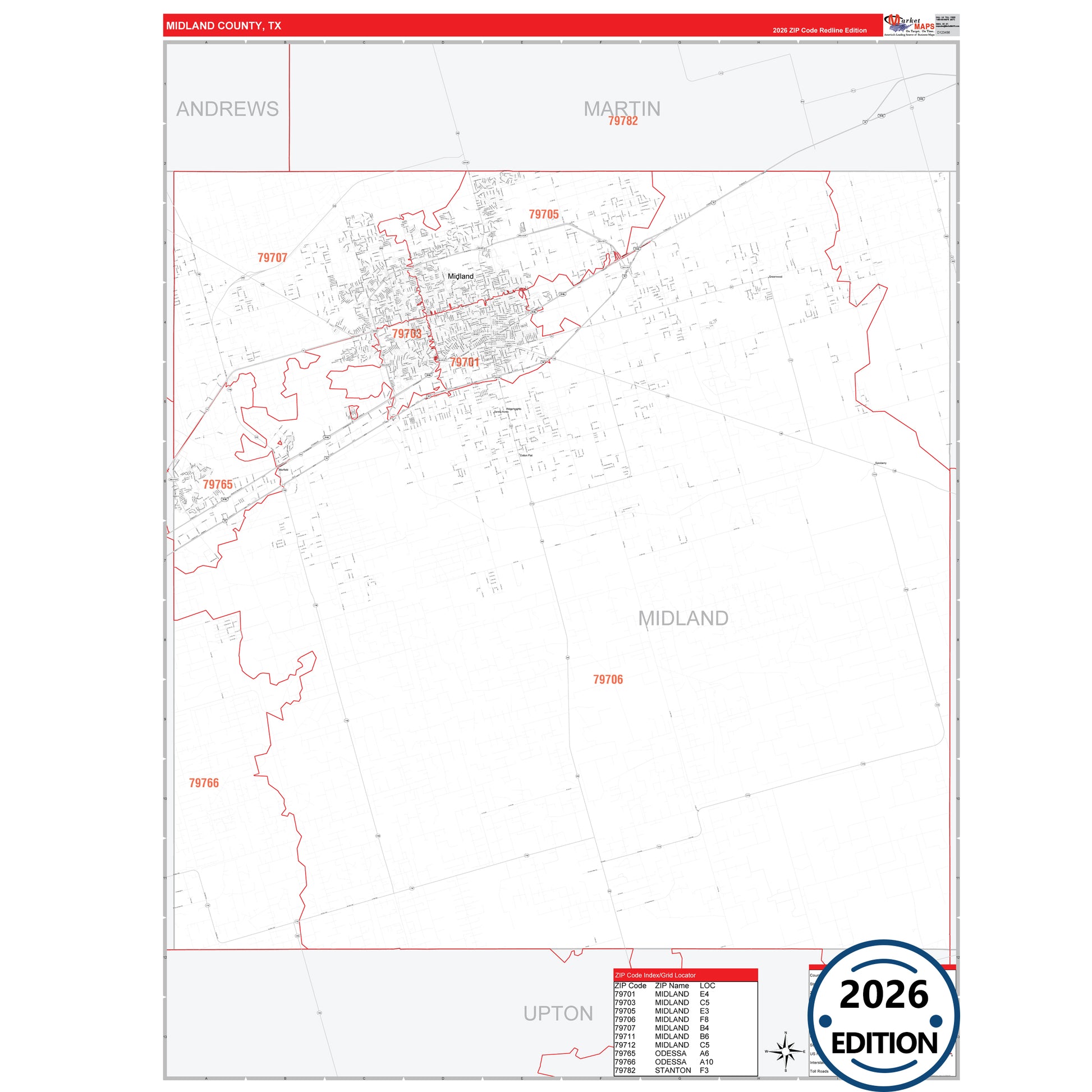 The RedLine Style map of Midland County, TX shows ZIP code areas overlaid on a detailed road network of Midland County, Texas. Ideal for drawing locations, territories, and other applications. Base map features include all major streets and highways labeled, cities and towns, county and state boundaries, neighborhood names, railroads, and a clean white background suitable for marking and planning.