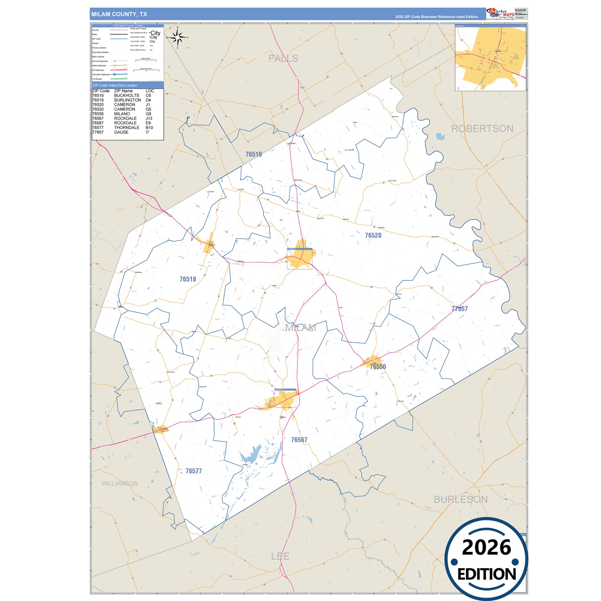 The Business Reference Style Milam County, TX is a detailed map that includes all towns, cities, major roadways, and highways. Available in multiple wall map sizes, perfect for home, school, office, or business display.