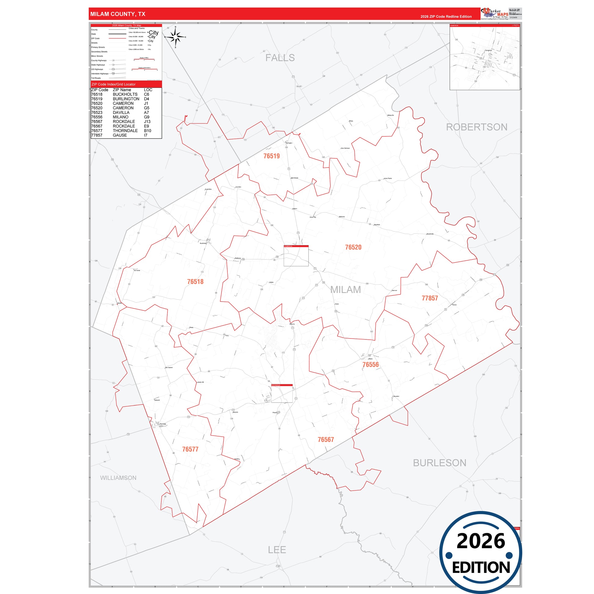 The RedLine Style map of Milam County, TX shows ZIP code areas overlaid on a detailed road network of Milam County, Texas. Ideal for drawing locations, territories, and other applications. Base map features include all major streets and highways labeled, cities and towns, county and state boundaries, neighborhood names, railroads, and a clean white background suitable for marking and planning.