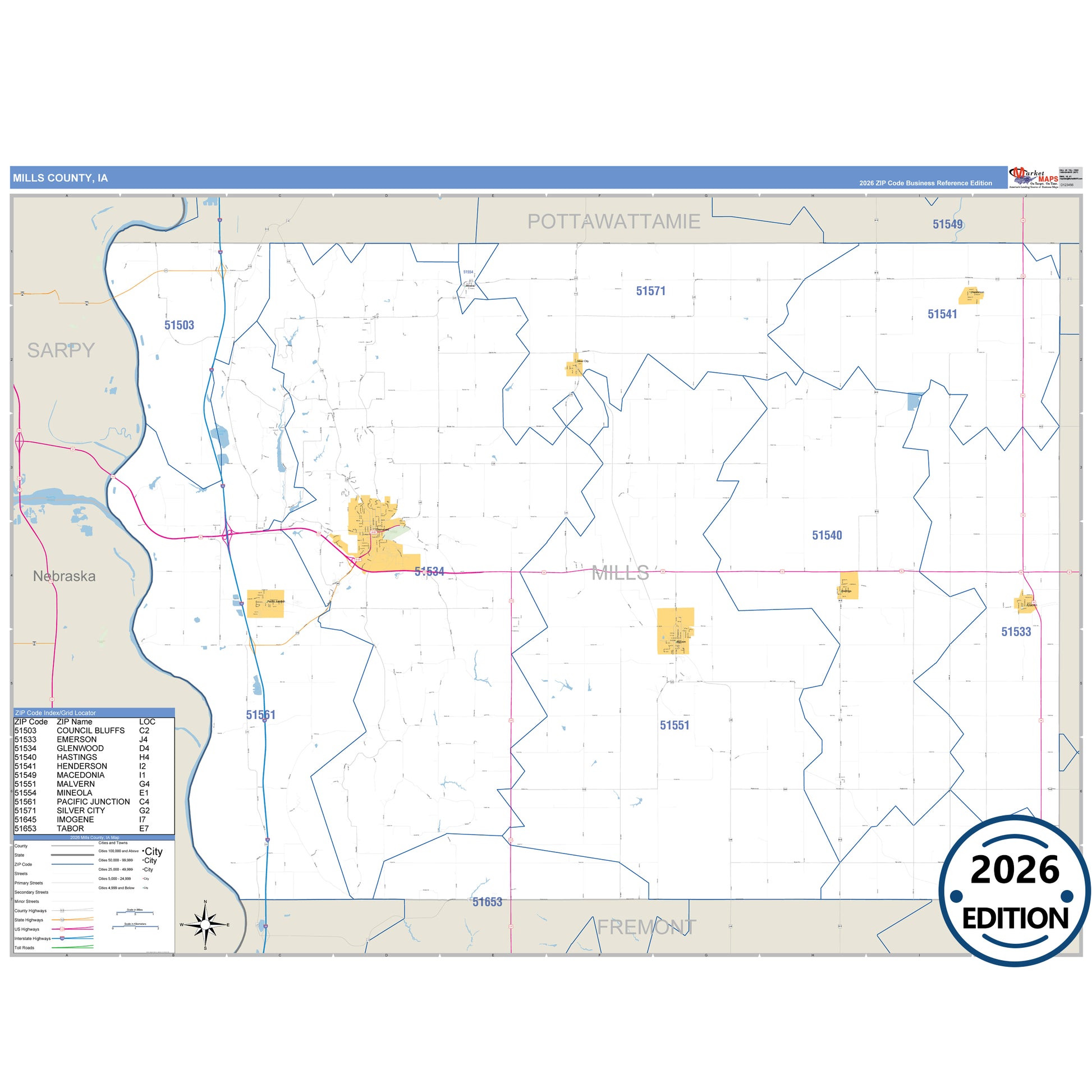 The Business Reference Style Mills County, IA is a detailed map that includes all towns, cities, major roadways, and highways. Available in multiple wall map sizes, perfect for home, school, office, or business display.