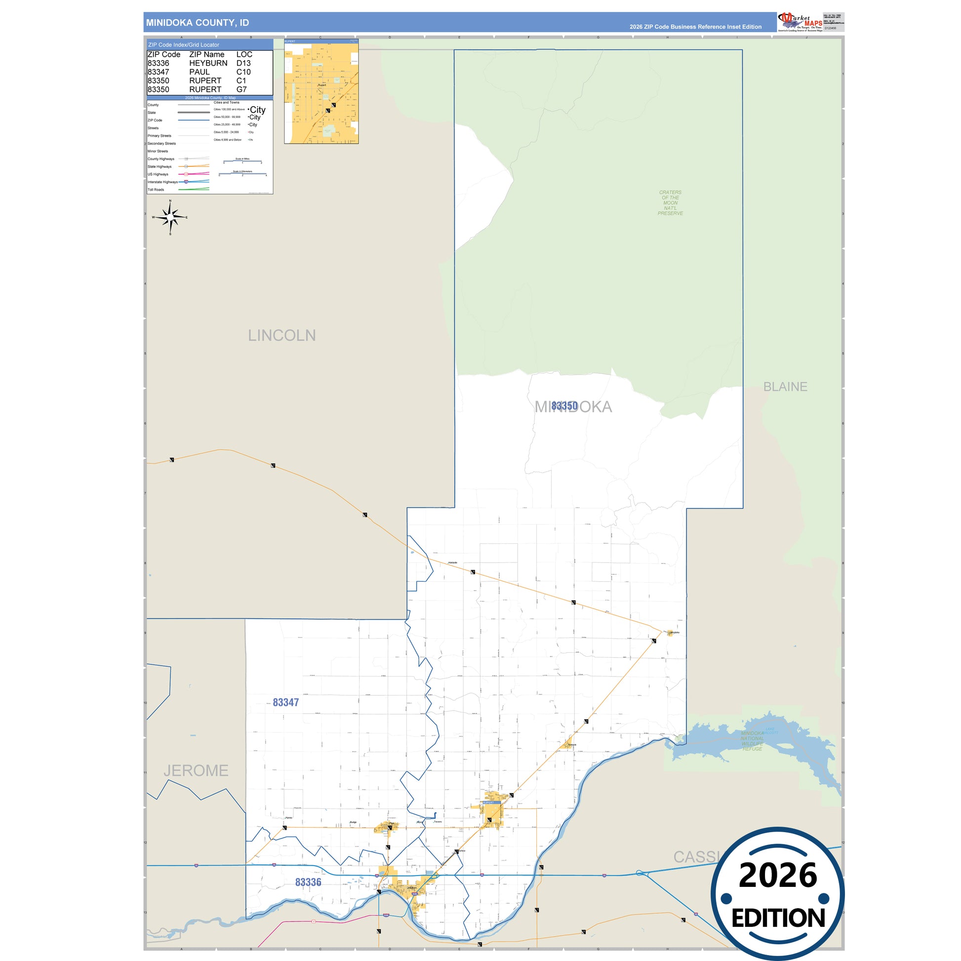 The Business Reference Style Minidoka County, ID is a detailed map that includes all towns, cities, major roadways, and highways. Available in multiple wall map sizes, perfect for home, school, office, or business display.