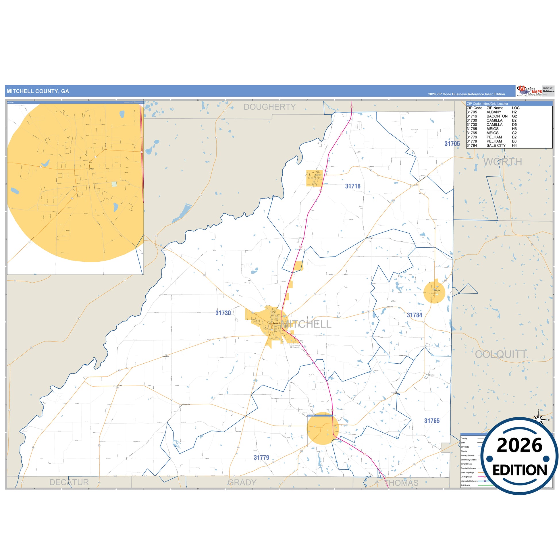 The Business Reference Style Mitchell County, GA is a detailed map that includes all towns, cities, major roadways, and highways. Available in multiple wall map sizes, perfect for home, school, office, or business display.