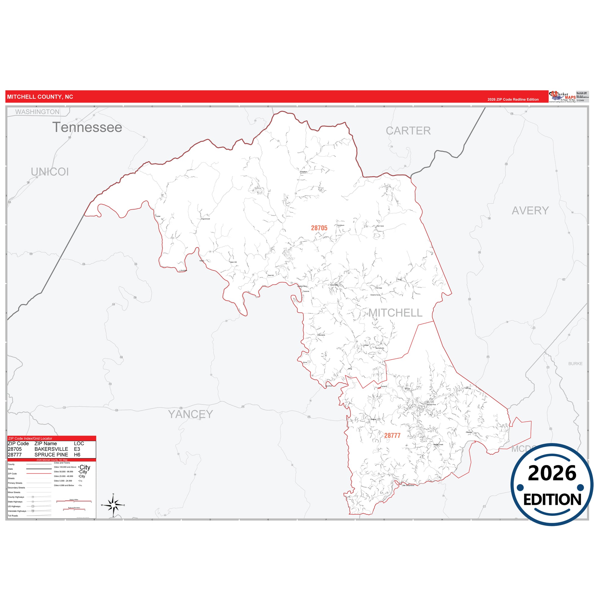 The RedLine Style map of Mitchell County, NC shows ZIP code areas overlaid on a detailed road network of Mitchell County, North Carolina. Ideal for drawing locations, territories, and other applications. Base map features include all major streets and highways labeled, cities and towns, county and state boundaries, neighborhood names, railroads, and a clean white background suitable for marking and planning.