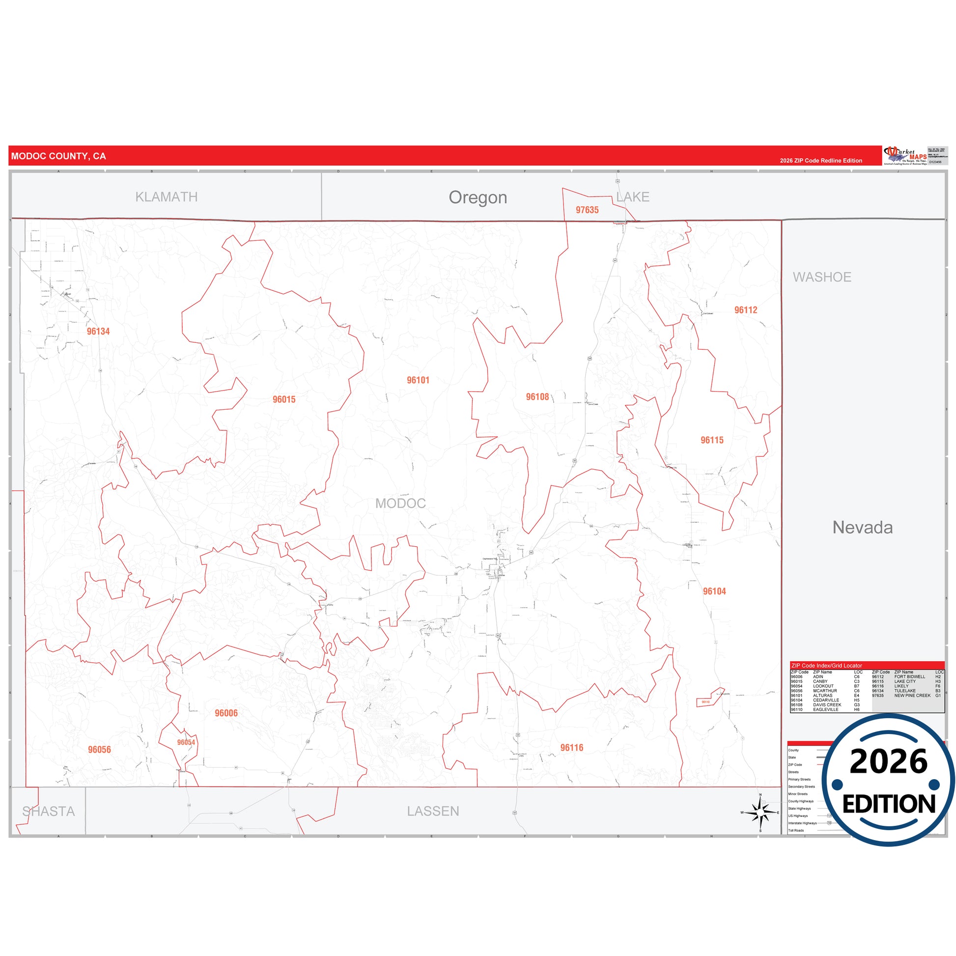 The RedLine Style map of Modoc County, CA shows ZIP code areas overlaid on a detailed road network of Modoc County, California. Ideal for drawing locations, territories, and other applications. Base map features include all major streets and highways labeled, cities and towns, county and state boundaries, neighborhood names, railroads, and a clean white background suitable for marking and planning.