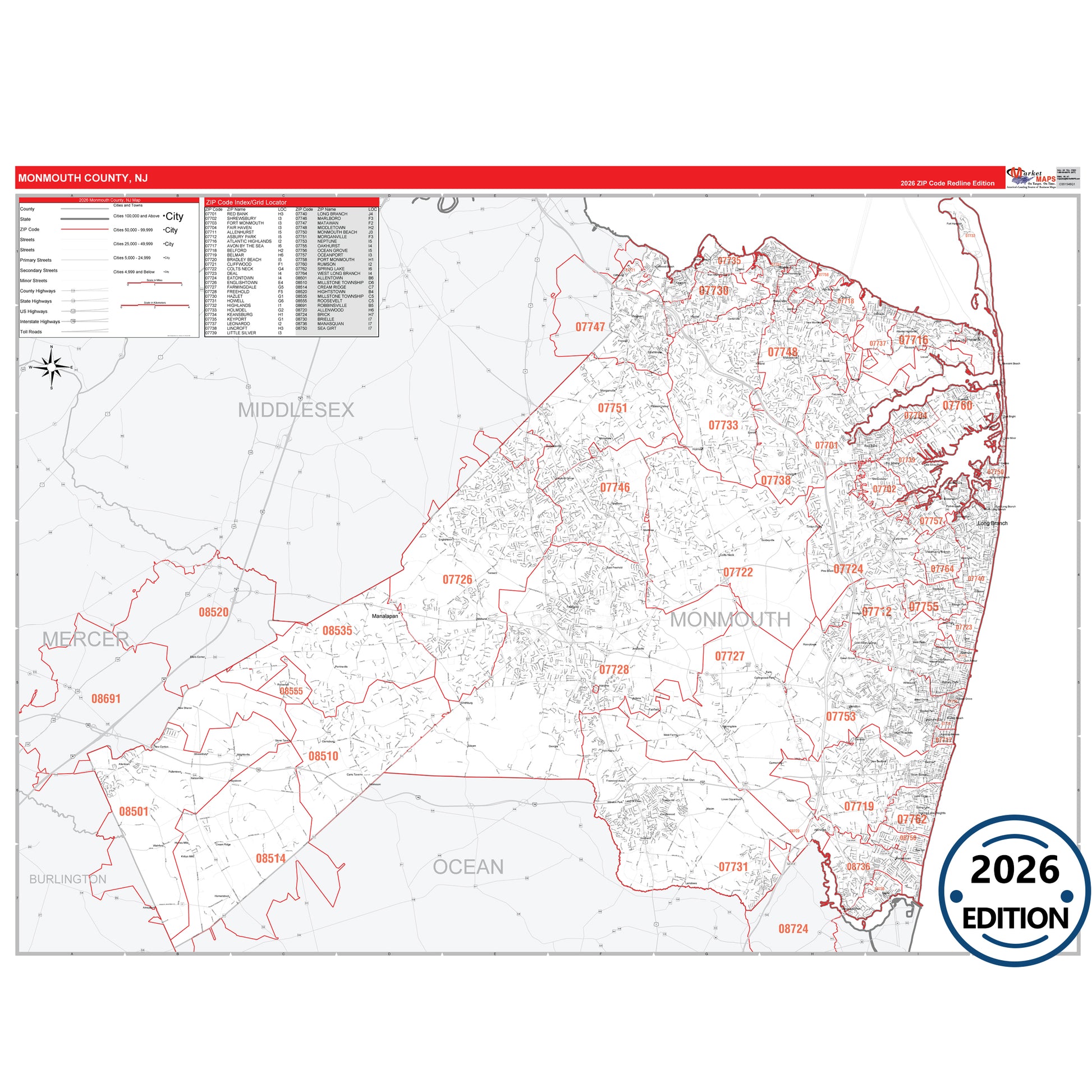 The RedLine Style map of Monmouth County, NJ shows ZIP code areas overlaid on a detailed road network of Monmouth County, New Jersey. Ideal for drawing locations, territories, and other applications. Base map features include all major streets and highways labeled, cities and towns, county and state boundaries, neighborhood names, railroads, and a clean white background suitable for marking and planning.