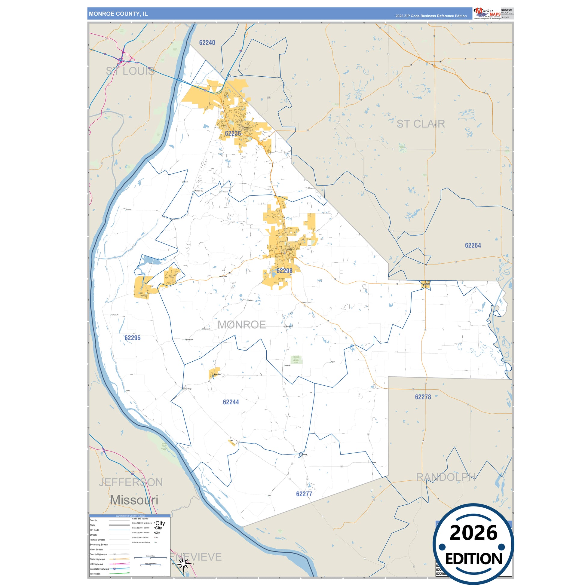 The Business Reference Style Monroe County, IL is a detailed map that includes all towns, cities, major roadways, and highways. Available in multiple wall map sizes, perfect for home, school, office, or business display.