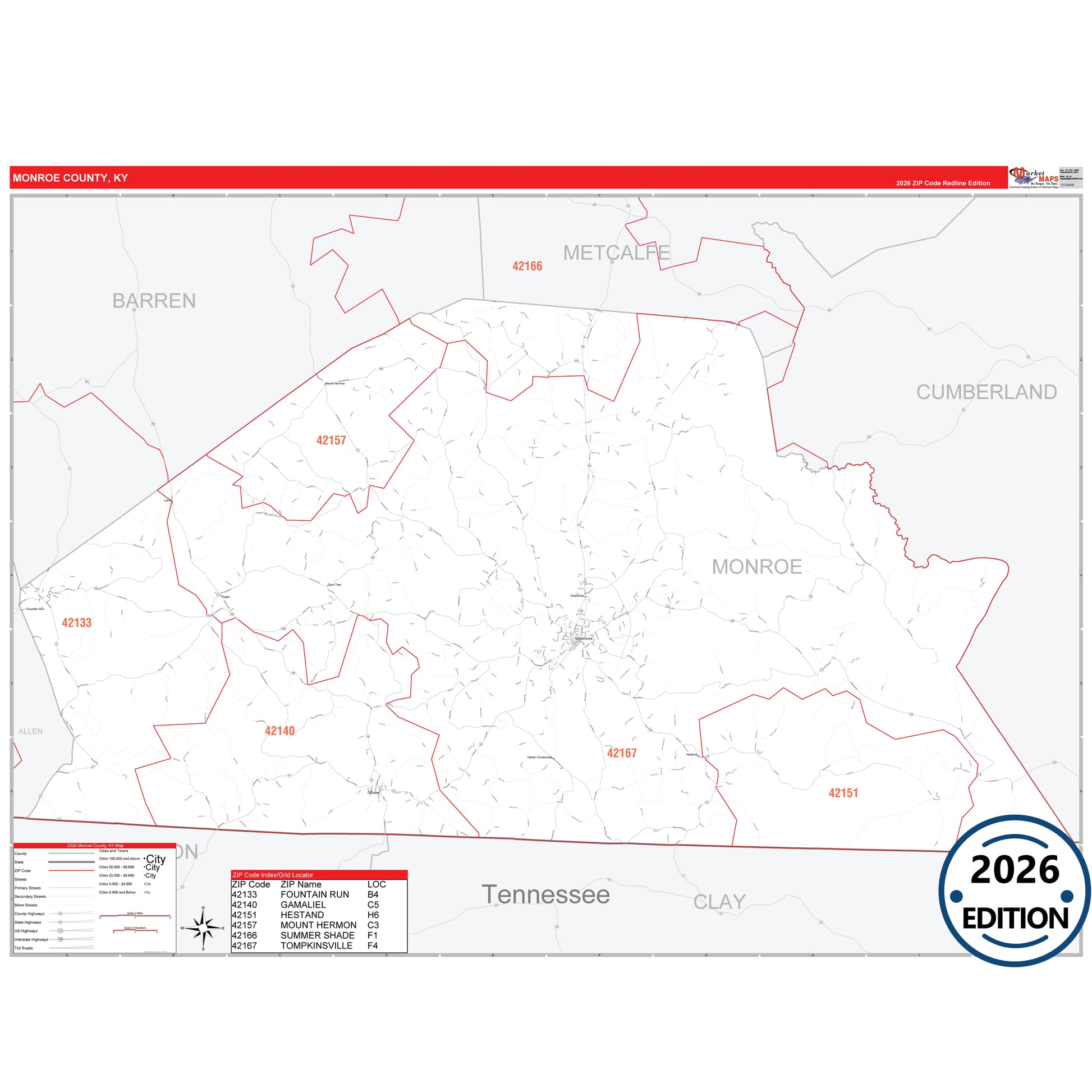 The RedLine Style map of Monroe County, KY shows ZIP code areas overlaid on a detailed road network of Monroe County, Kentucky. Ideal for drawing locations, territories, and other applications. Base map features include all major streets and highways labeled, cities and towns, county and state boundaries, neighborhood names, railroads, and a clean white background suitable for marking and planning.