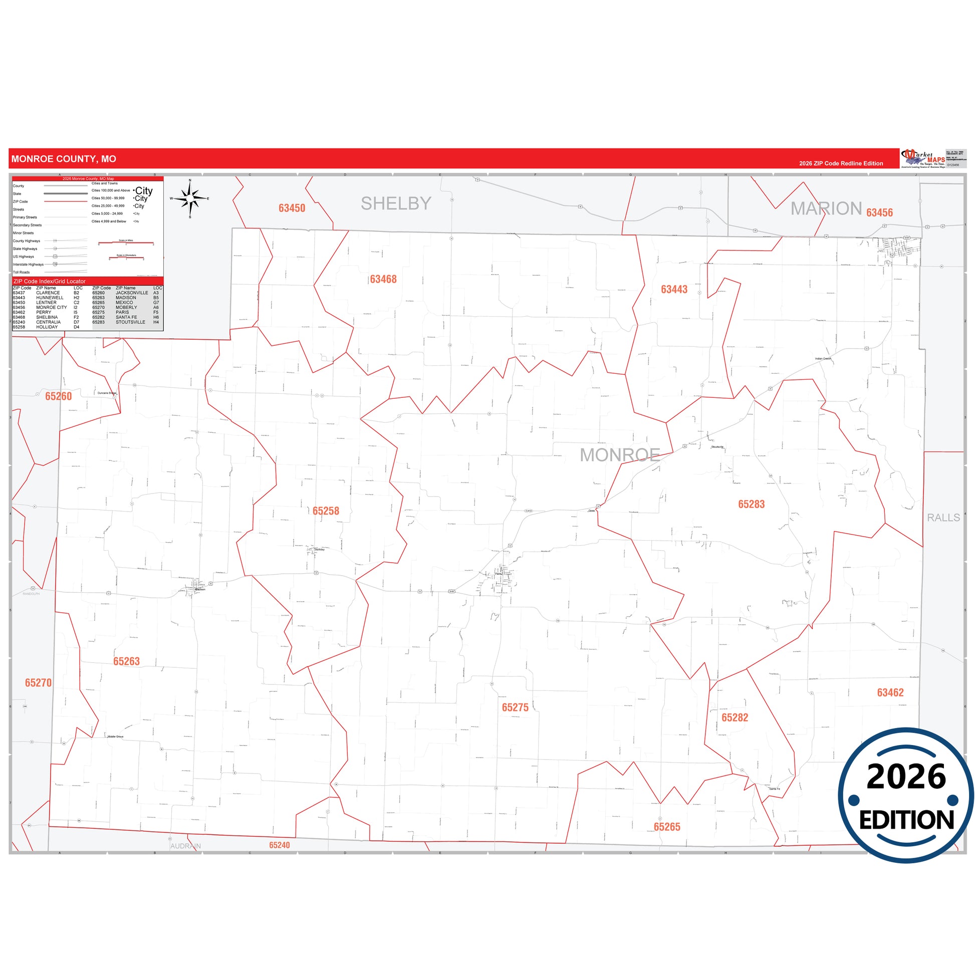 The RedLine Style map of Monroe County, MO shows ZIP code areas overlaid on a detailed road network of Monroe County, Missouri. Ideal for drawing locations, territories, and other applications. Base map features include all major streets and highways labeled, cities and towns, county and state boundaries, neighborhood names, railroads, and a clean white background suitable for marking and planning.