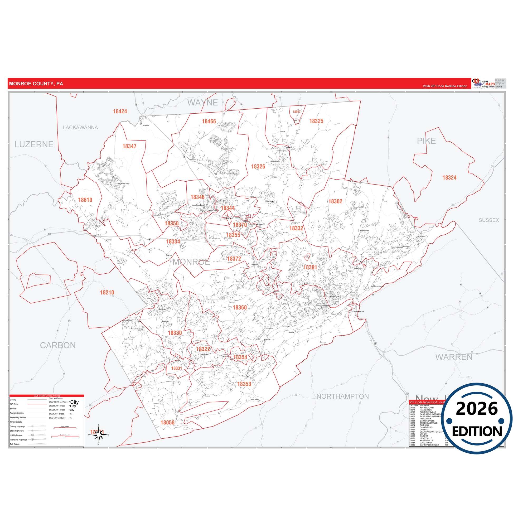 The RedLine Style map of Monroe County, PA shows ZIP code areas overlaid on a detailed road network of Monroe County, Pennsylvania. Ideal for drawing locations, territories, and other applications. Base map features include all major streets and highways labeled, cities and towns, county and state boundaries, neighborhood names, railroads, and a clean white background suitable for marking and planning.