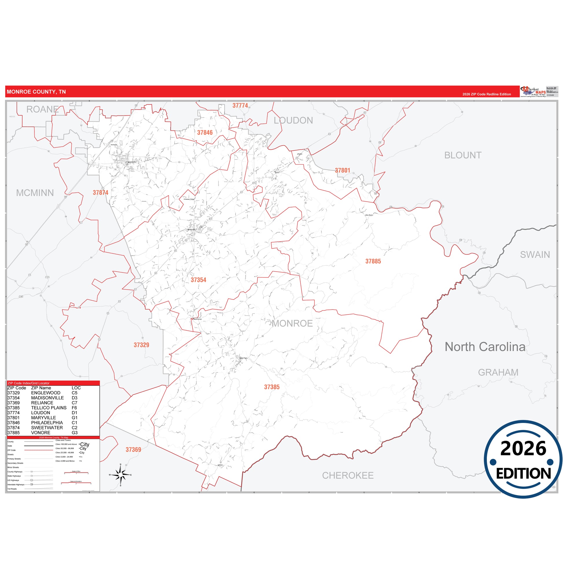 The RedLine Style map of Monroe County, TN shows ZIP code areas overlaid on a detailed road network of Monroe County, Tennessee. Ideal for drawing locations, territories, and other applications. Base map features include all major streets and highways labeled, cities and towns, county and state boundaries, neighborhood names, railroads, and a clean white background suitable for marking and planning.