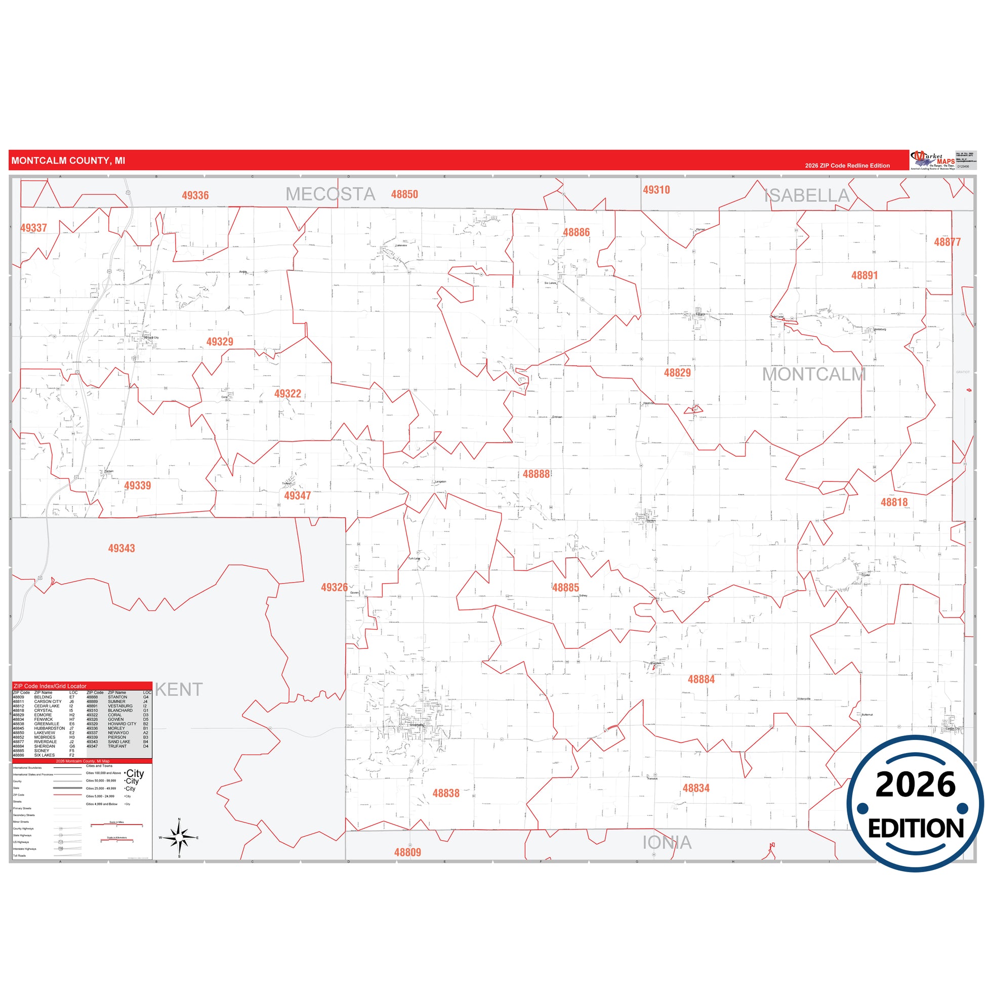 The RedLine Style map of Montcalm County, MI shows ZIP code areas overlaid on a detailed road network of Montcalm County, Michigan. Ideal for drawing locations, territories, and other applications. Base map features include all major streets and highways labeled, cities and towns, county and state boundaries, neighborhood names, railroads, and a clean white background suitable for marking and planning.