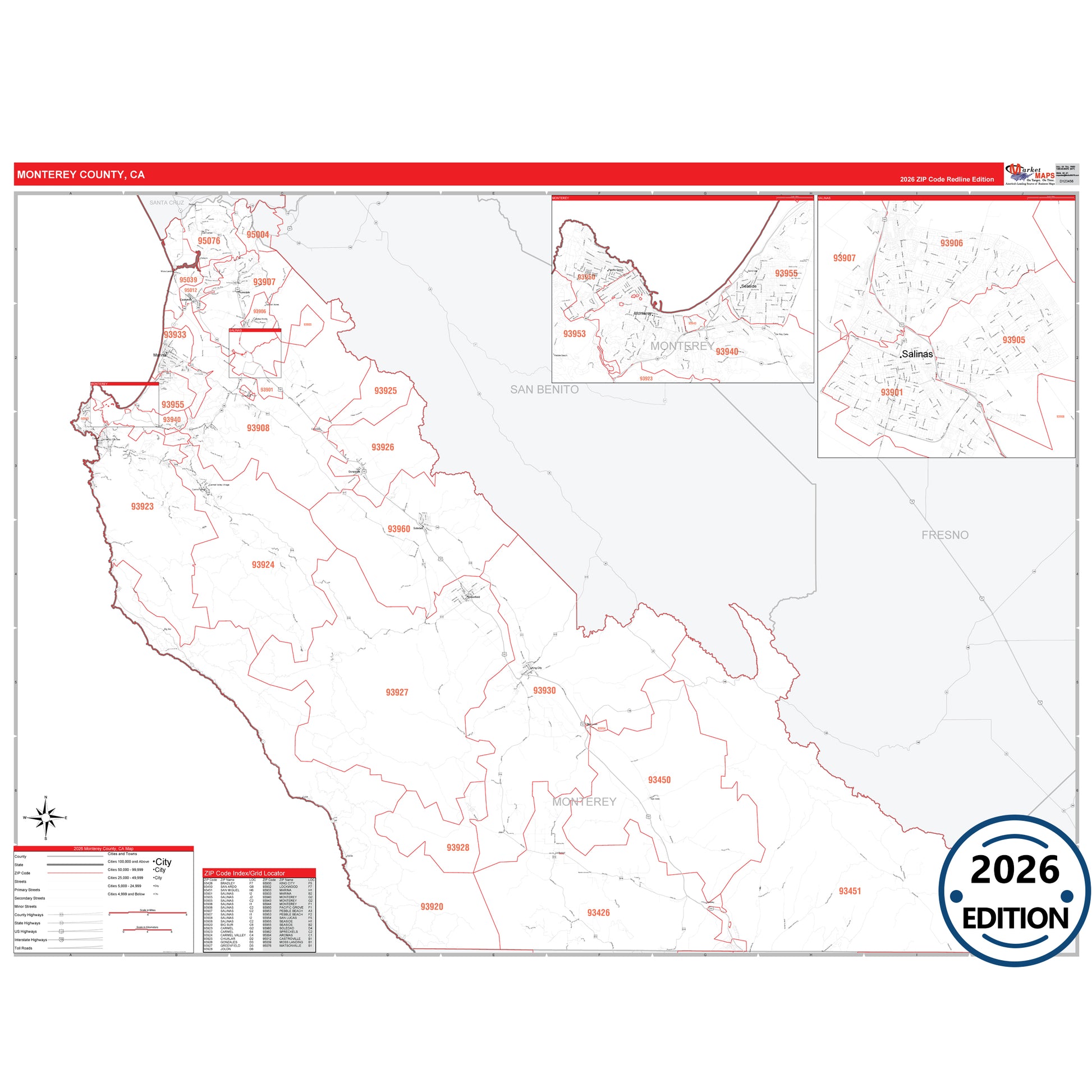 The RedLine Style map of Monterey County, CA shows ZIP code areas overlaid on a detailed road network of Monterey County, California. Ideal for drawing locations, territories, and other applications. Base map features include all major streets and highways labeled, cities and towns, county and state boundaries, neighborhood names, railroads, and a clean white background suitable for marking and planning.