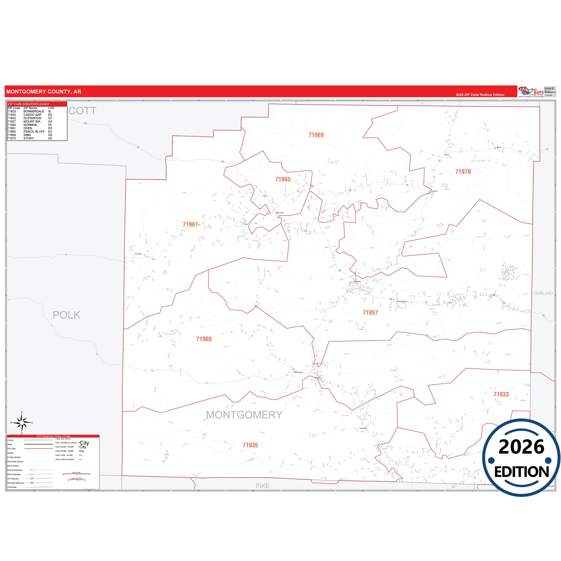 The RedLine Style map of Montgomery County, AR shows ZIP code areas overlaid on a detailed road network of Montgomery County, Arkansas. Ideal for drawing locations, territories, and other applications. Base map features include all major streets and highways labeled, cities and towns, county and state boundaries, neighborhood names, railroads, and a clean white background suitable for marking and planning.