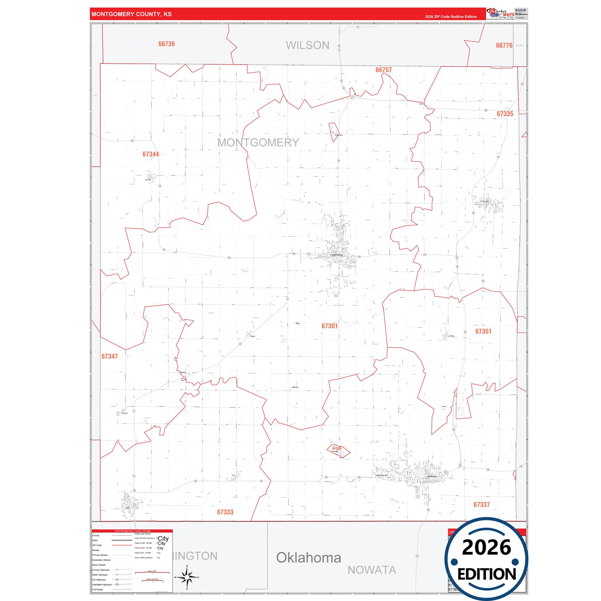 The RedLine Style map of Montgomery County, KS shows ZIP code areas overlaid on a detailed road network of Montgomery County, Kansas. Ideal for drawing locations, territories, and other applications. Base map features include all major streets and highways labeled, cities and towns, county and state boundaries, neighborhood names, railroads, and a clean white background suitable for marking and planning.