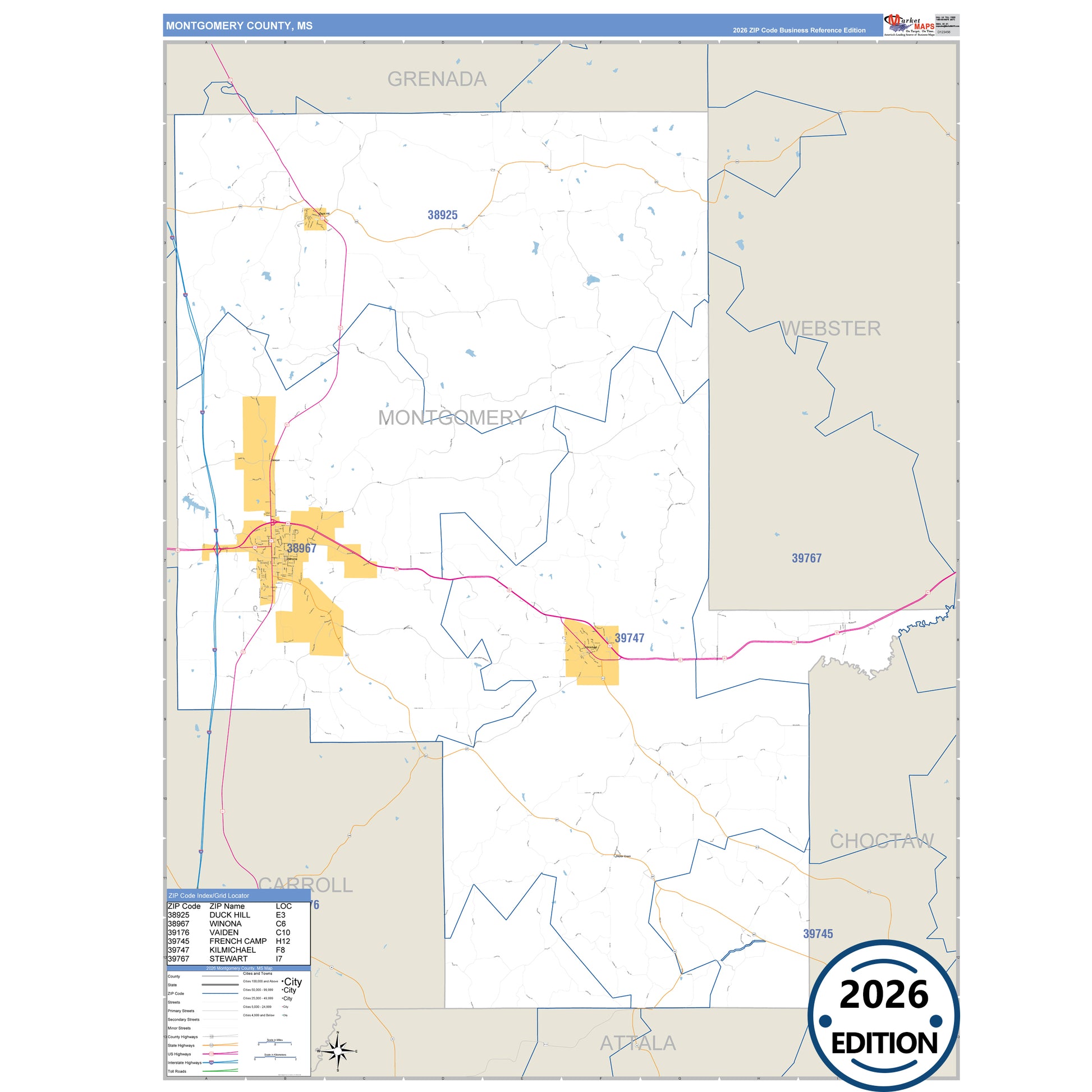 The Business Reference Style Montgomery County, MS is a detailed map that includes all towns, cities, major roadways, and highways. Available in multiple wall map sizes, perfect for home, school, office, or business display.