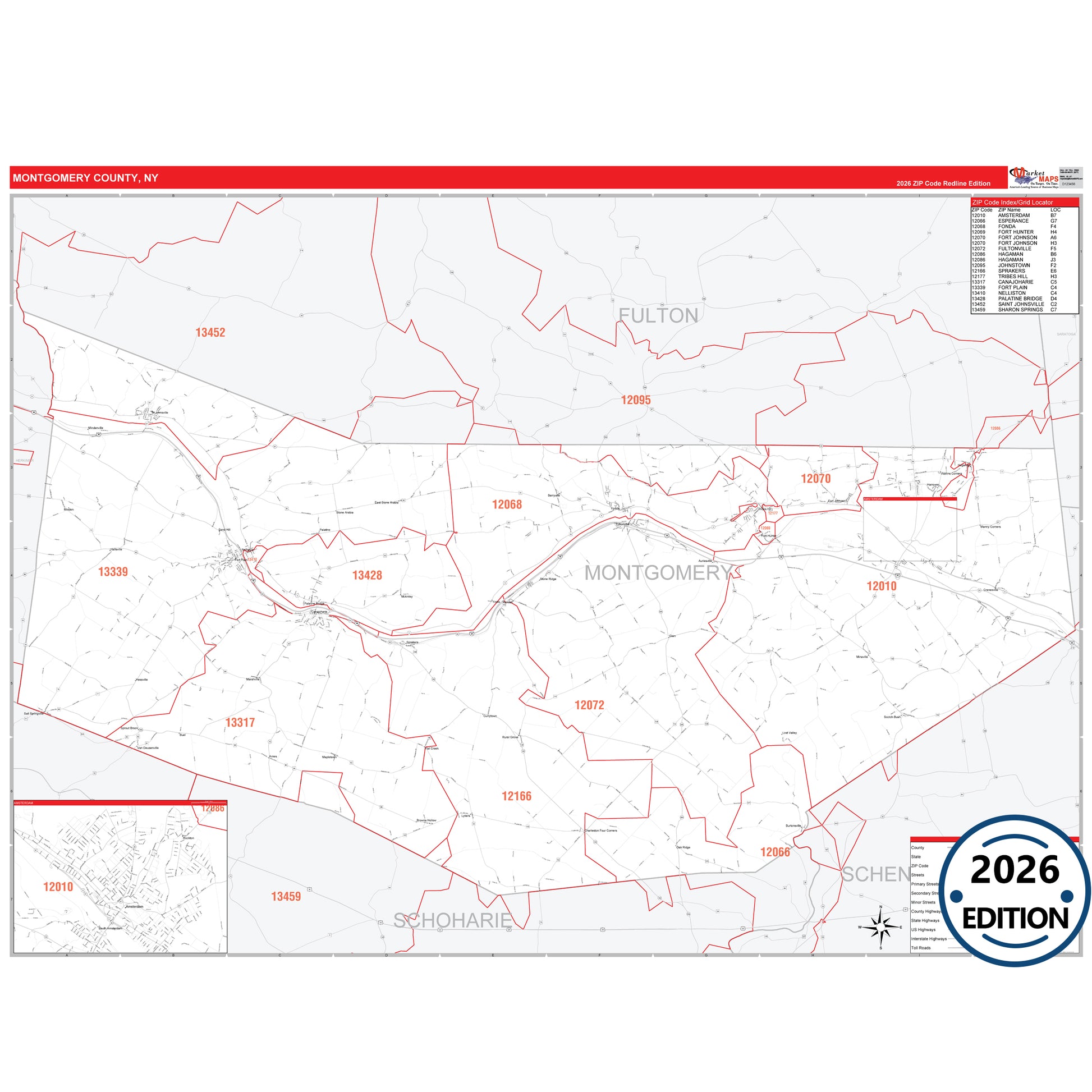 The RedLine Style map of Montgomery County, NY shows ZIP code areas overlaid on a detailed road network of Montgomery County, New York. Ideal for drawing locations, territories, and other applications. Base map features include all major streets and highways labeled, cities and towns, county and state boundaries, neighborhood names, railroads, and a clean white background suitable for marking and planning.