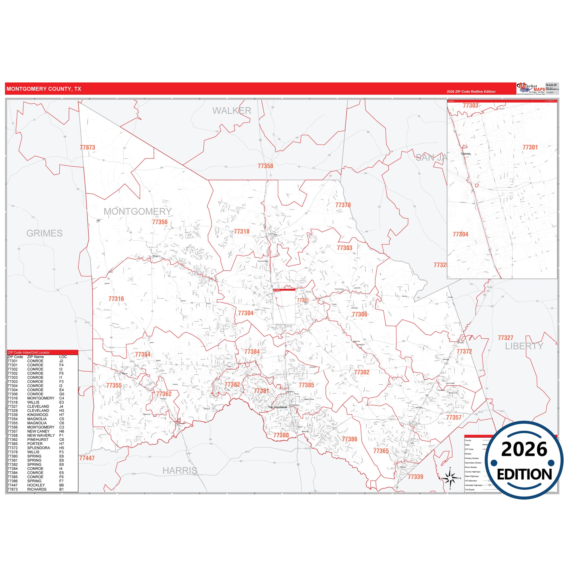 The RedLine Style map of Montgomery County, TX shows ZIP code areas overlaid on a detailed road network of Montgomery County, Texas. Ideal for drawing locations, territories, and other applications. Base map features include all major streets and highways labeled, cities and towns, county and state boundaries, neighborhood names, railroads, and a clean white background suitable for marking and planning.