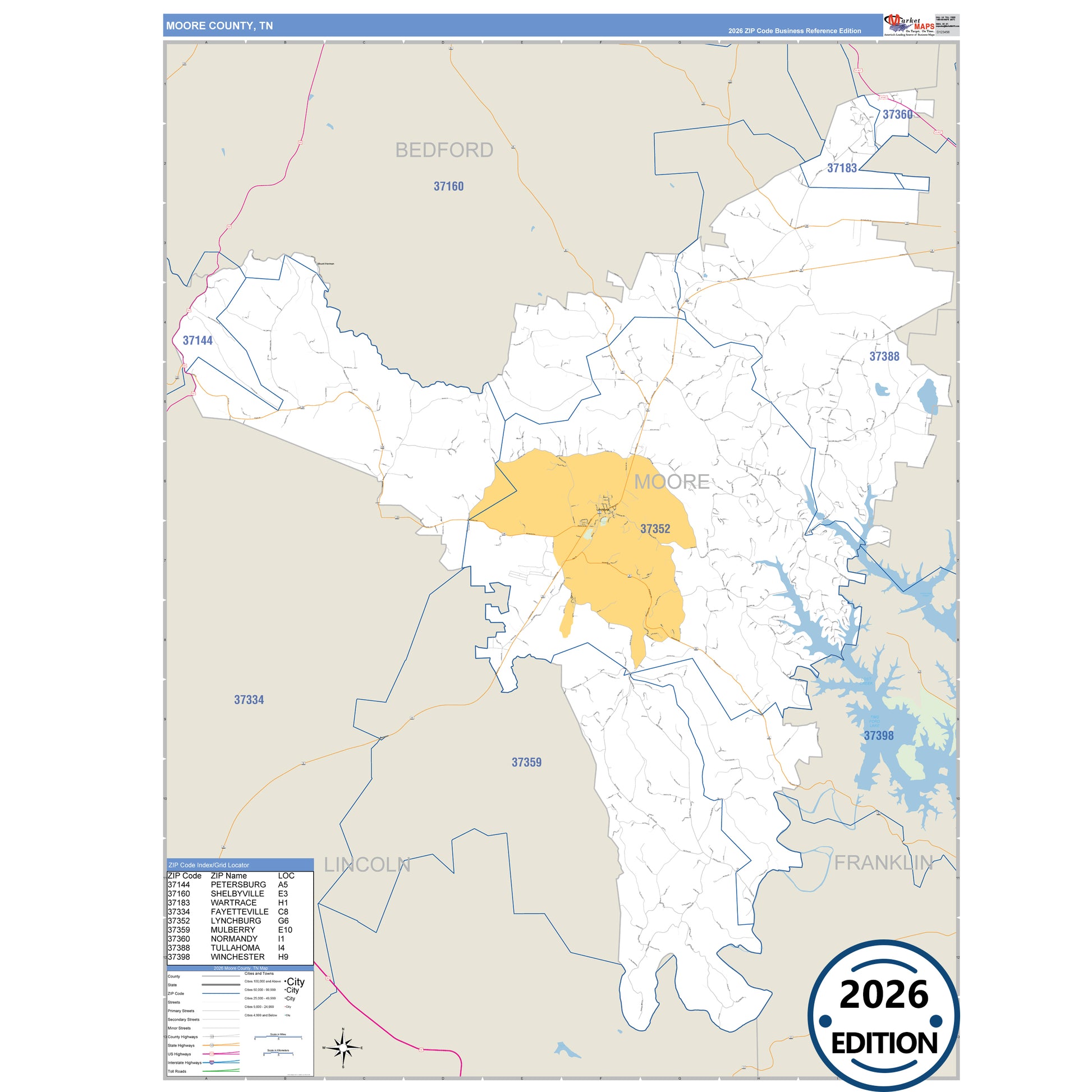 The Business Reference Style Moore County, TN is a detailed map that includes all towns, cities, major roadways, and highways. Available in multiple wall map sizes, perfect for home, school, office, or business display.