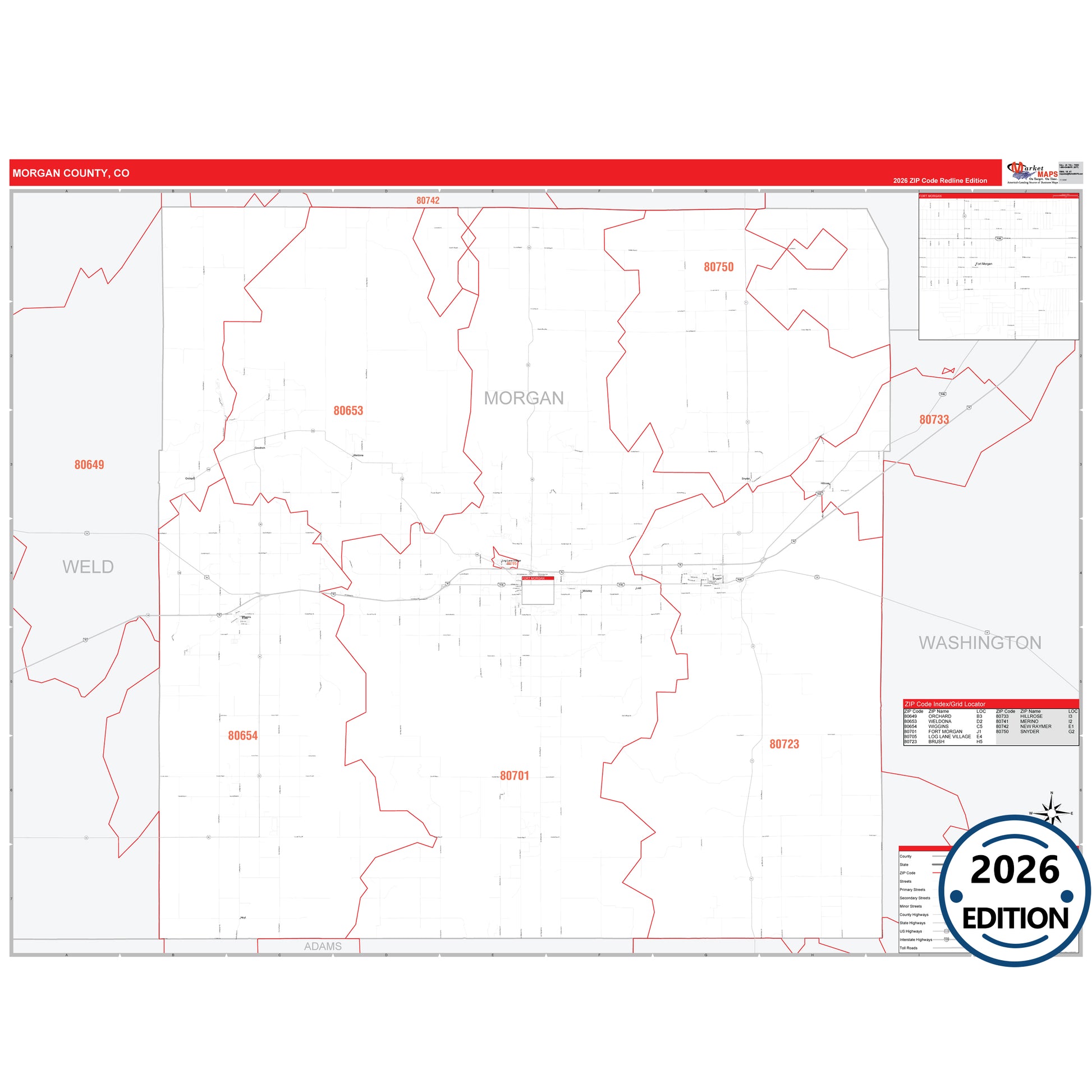 The RedLine Style map of Morgan County, CO shows ZIP code areas overlaid on a detailed road network of Morgan County, Colorado. Ideal for drawing locations, territories, and other applications. Base map features include all major streets and highways labeled, cities and towns, county and state boundaries, neighborhood names, railroads, and a clean white background suitable for marking and planning.