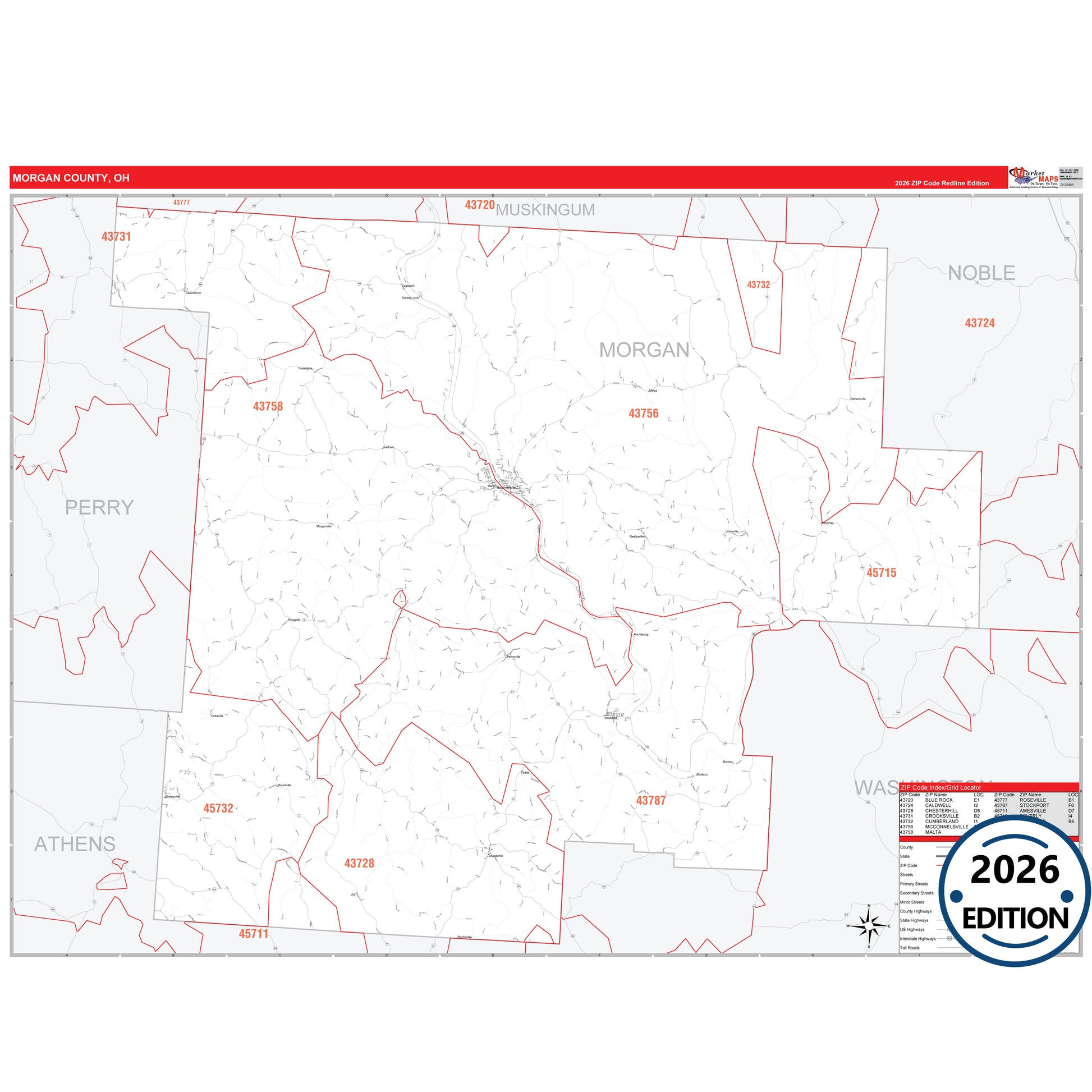 The RedLine Style map of Morgan County, OH shows ZIP code areas overlaid on a detailed road network of Morgan County, Ohio. Ideal for drawing locations, territories, and other applications. Base map features include all major streets and highways labeled, cities and towns, county and state boundaries, neighborhood names, railroads, and a clean white background suitable for marking and planning.