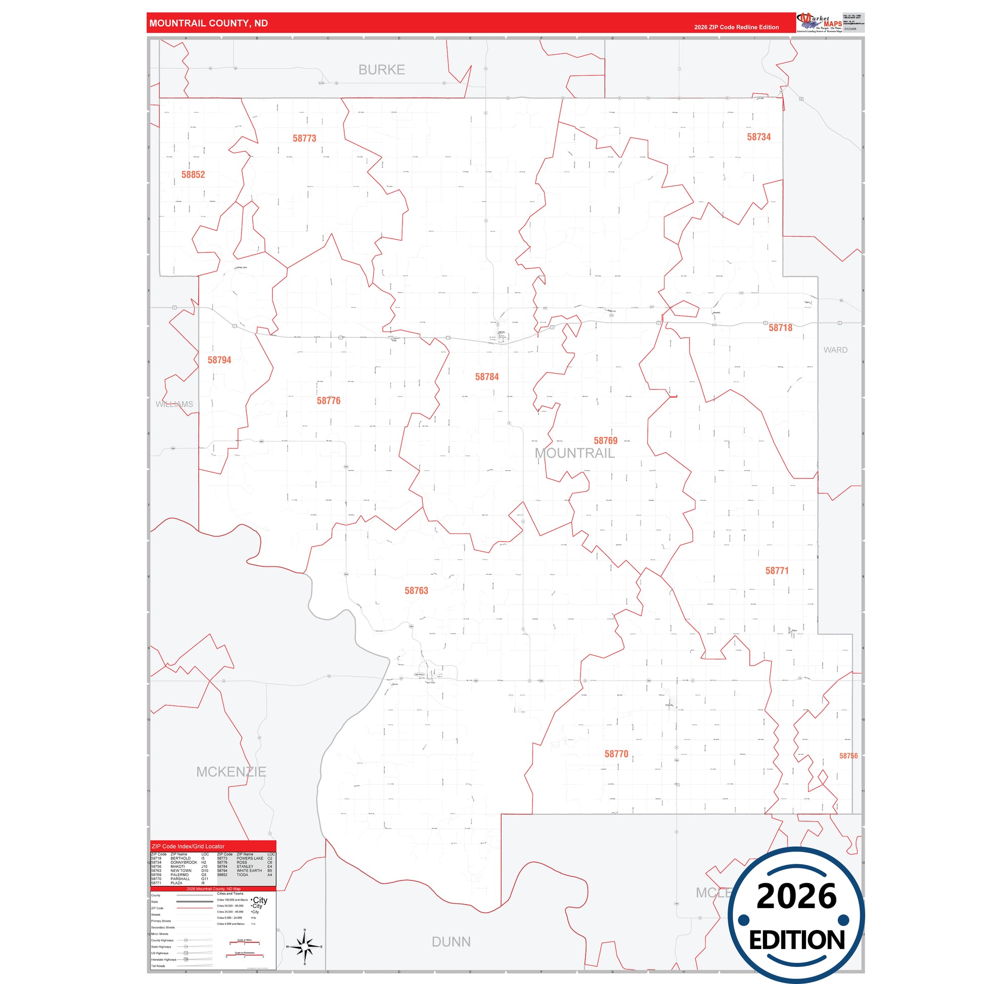 The RedLine Style map of Mountrail County, ND shows ZIP code areas overlaid on a detailed road network of Mountrail County, North Dakota. Ideal for drawing locations, territories, and other applications. Base map features include all major streets and highways labeled, cities and towns, county and state boundaries, neighborhood names, railroads, and a clean white background suitable for marking and planning.
