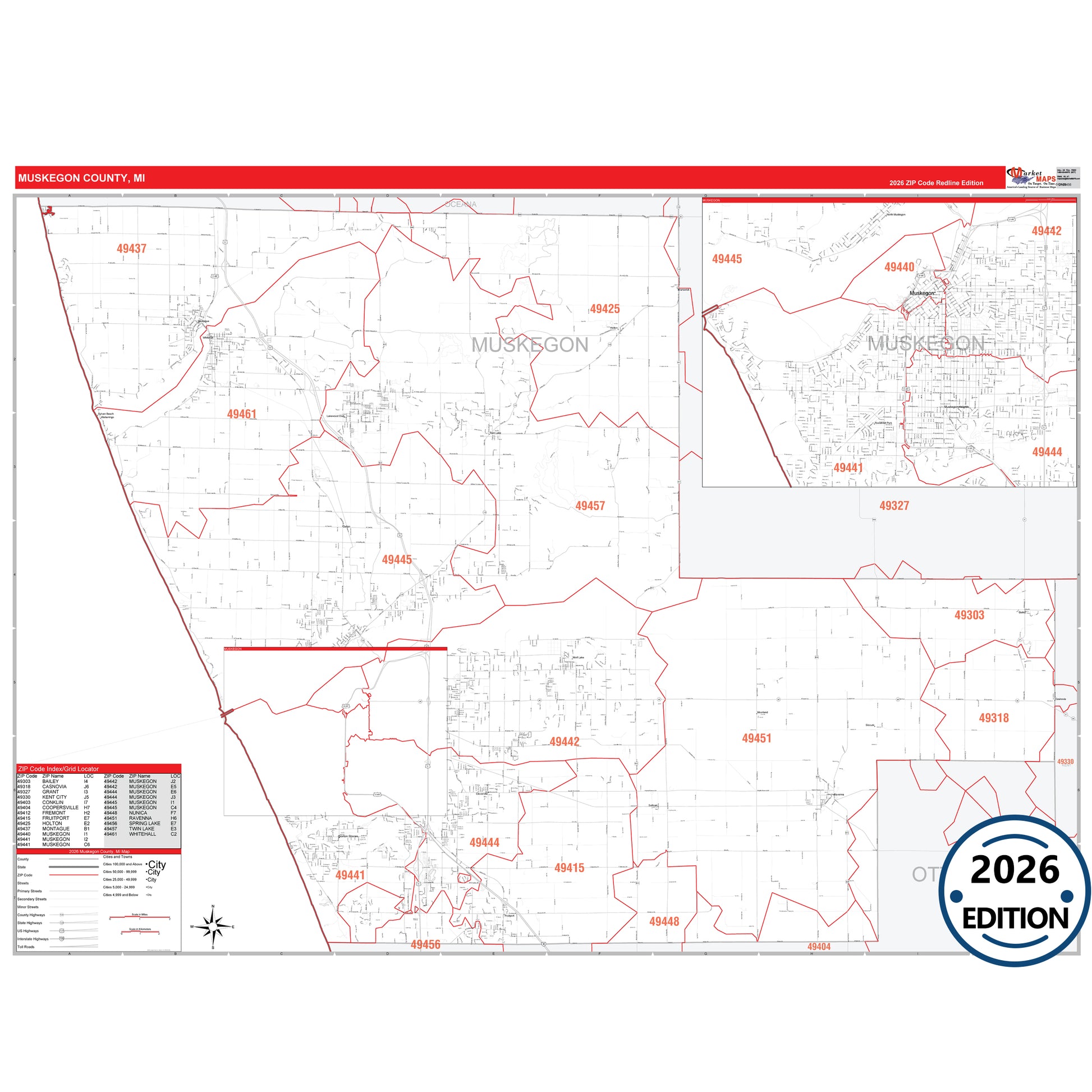 The RedLine Style map of Muskegon County, MI shows ZIP code areas overlaid on a detailed road network of Muskegon County, Michigan. Ideal for drawing locations, territories, and other applications. Base map features include all major streets and highways labeled, cities and towns, county and state boundaries, neighborhood names, railroads, and a clean white background suitable for marking and planning.
