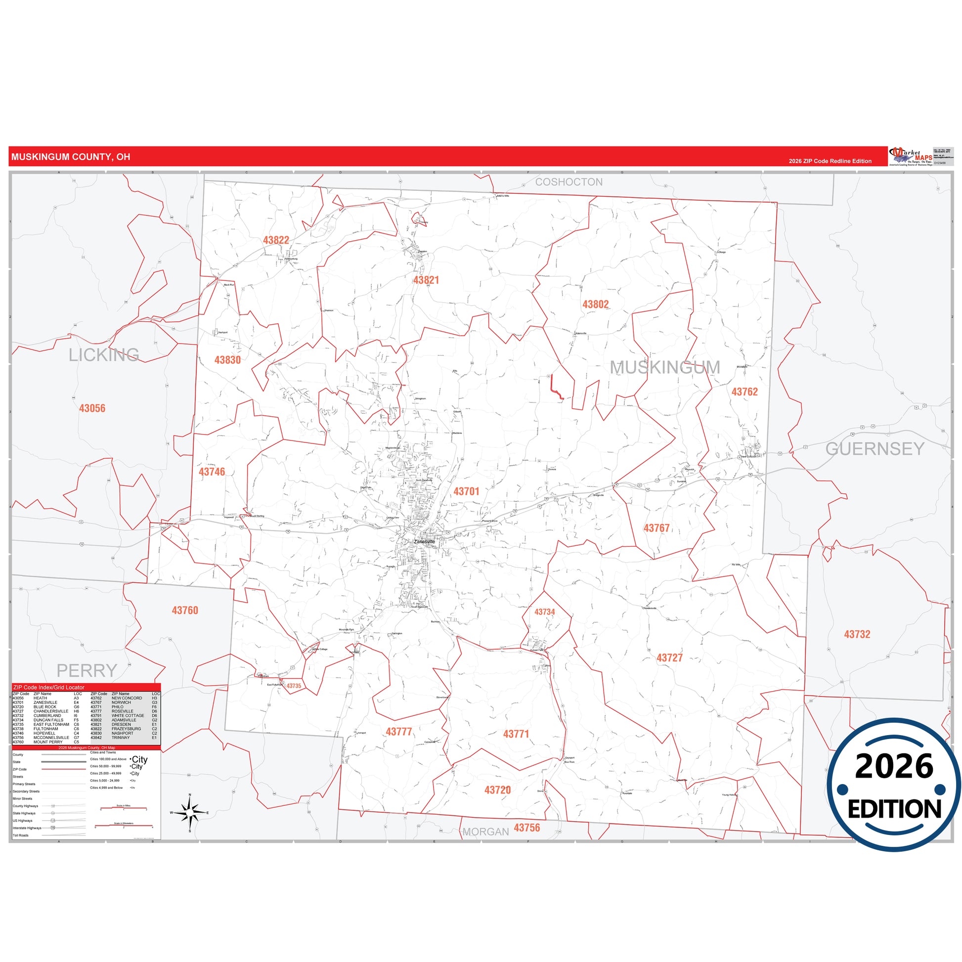 The RedLine Style map of Muskingum County, OH shows ZIP code areas overlaid on a detailed road network of Muskingum County, Ohio. Ideal for drawing locations, territories, and other applications. Base map features include all major streets and highways labeled, cities and towns, county and state boundaries, neighborhood names, railroads, and a clean white background suitable for marking and planning.