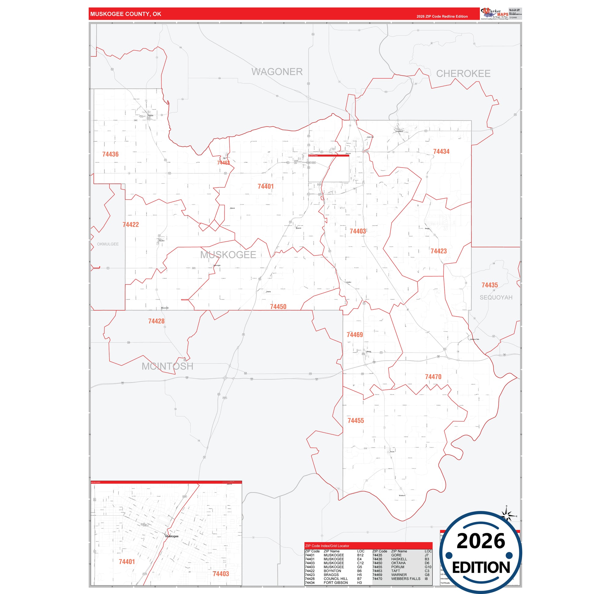 The RedLine Style map of Muskogee County, OK shows ZIP code areas overlaid on a detailed road network of Muskogee County, Oklahoma. Ideal for drawing locations, territories, and other applications. Base map features include all major streets and highways labeled, cities and towns, county and state boundaries, neighborhood names, railroads, and a clean white background suitable for marking and planning.