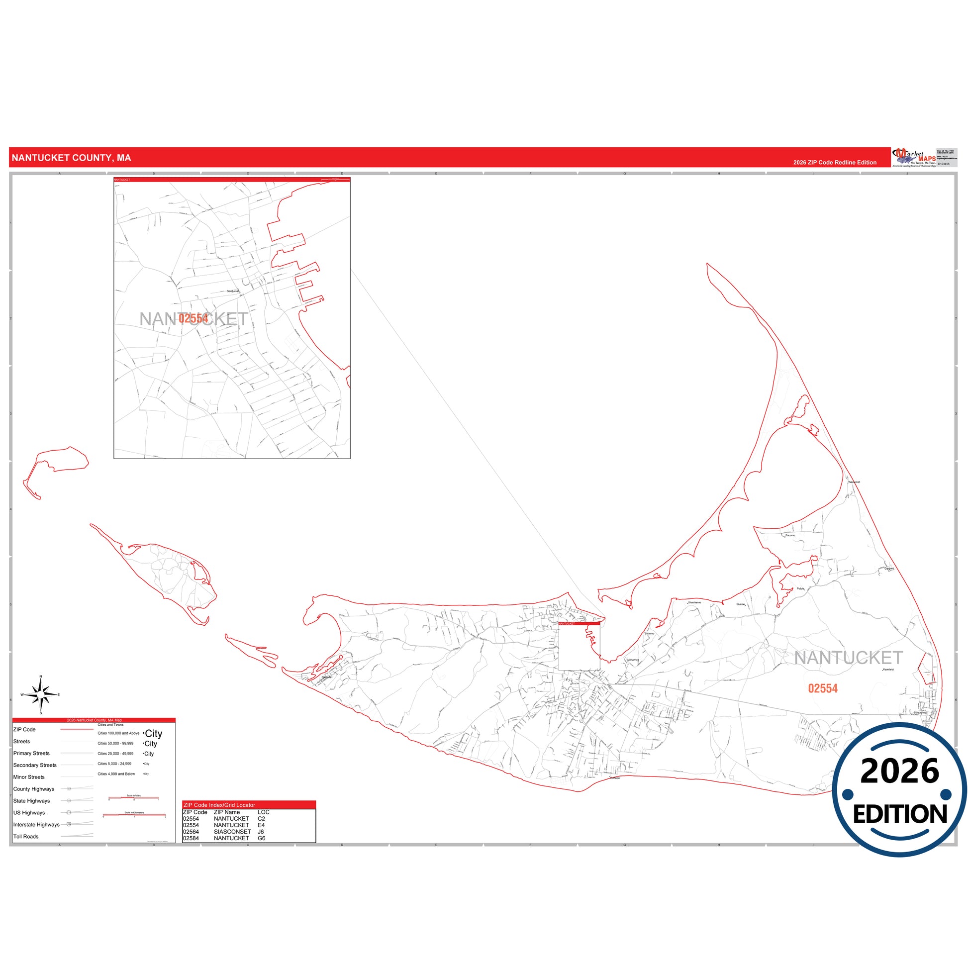 The RedLine Style map of Nantucket County, MA shows ZIP code areas overlaid on a detailed road network of Nantucket County, Massachusetts. Ideal for drawing locations, territories, and other applications. Base map features include all major streets and highways labeled, cities and towns, county and state boundaries, neighborhood names, railroads, and a clean white background suitable for marking and planning.