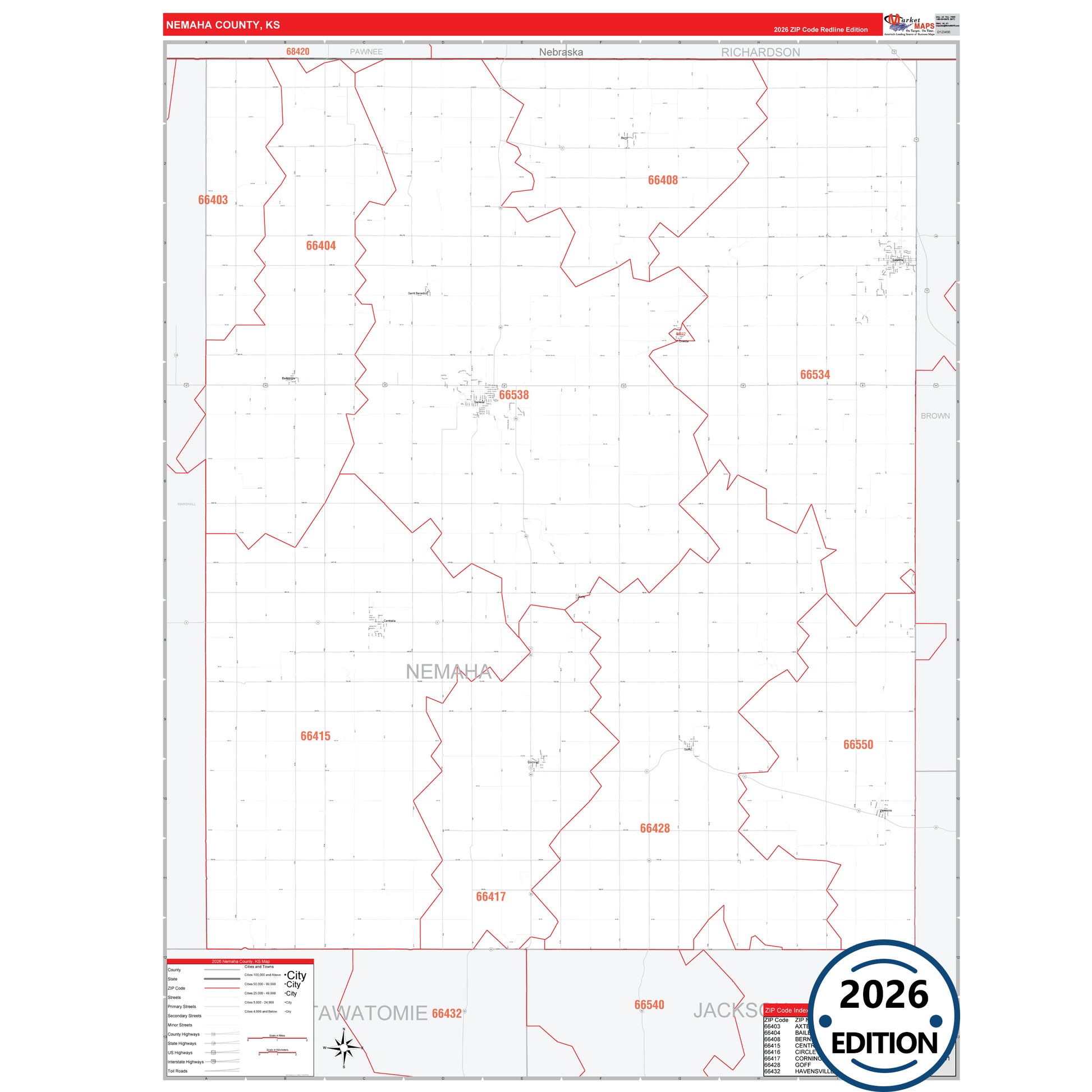 The RedLine Style map of Nemaha County, KS shows ZIP code areas overlaid on a detailed road network of Nemaha County, Kansas. Ideal for drawing locations, territories, and other applications. Base map features include all major streets and highways labeled, cities and towns, county and state boundaries, neighborhood names, railroads, and a clean white background suitable for marking and planning.