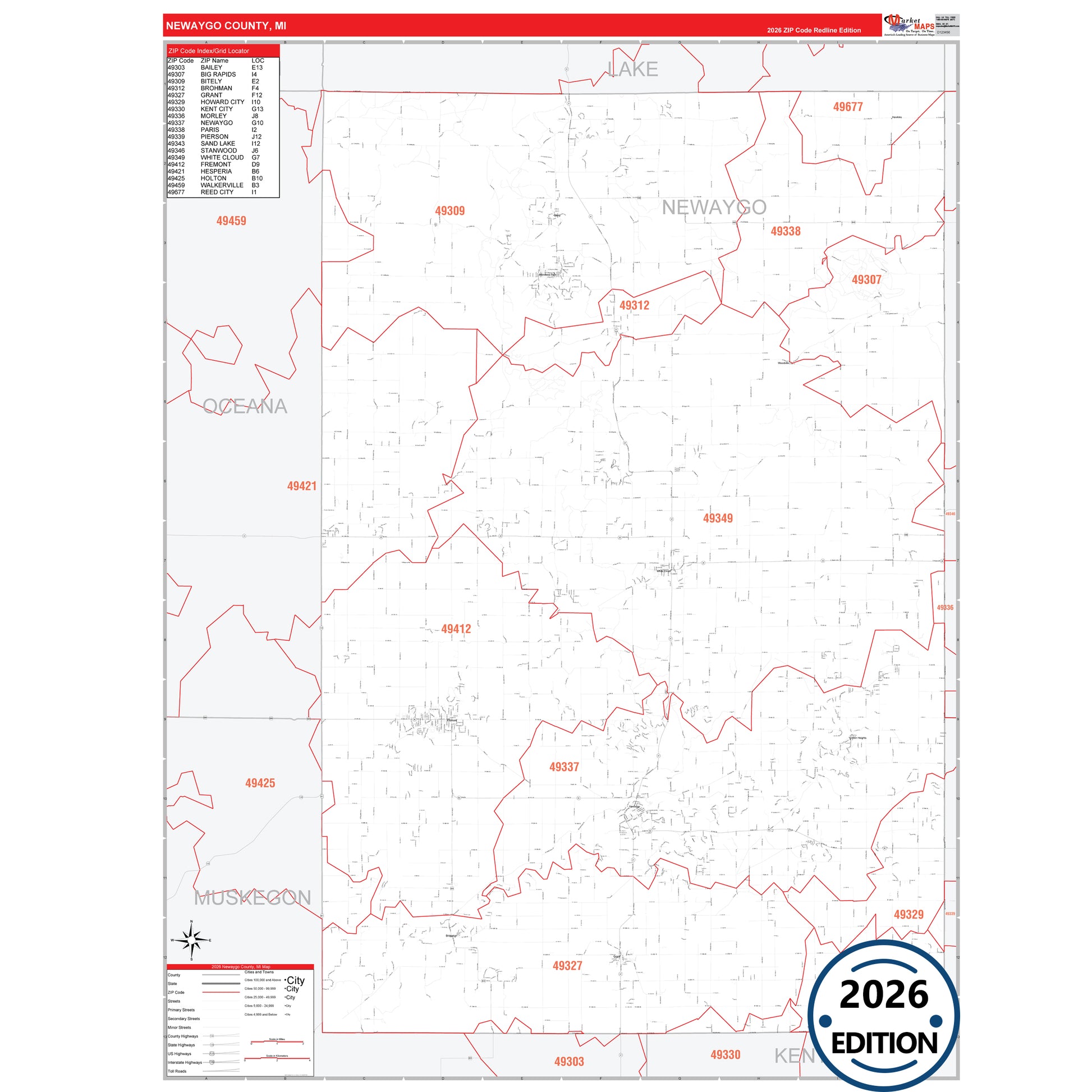 The RedLine Style map of Newaygo County, MI shows ZIP code areas overlaid on a detailed road network of Newaygo County, Michigan. Ideal for drawing locations, territories, and other applications. Base map features include all major streets and highways labeled, cities and towns, county and state boundaries, neighborhood names, railroads, and a clean white background suitable for marking and planning.