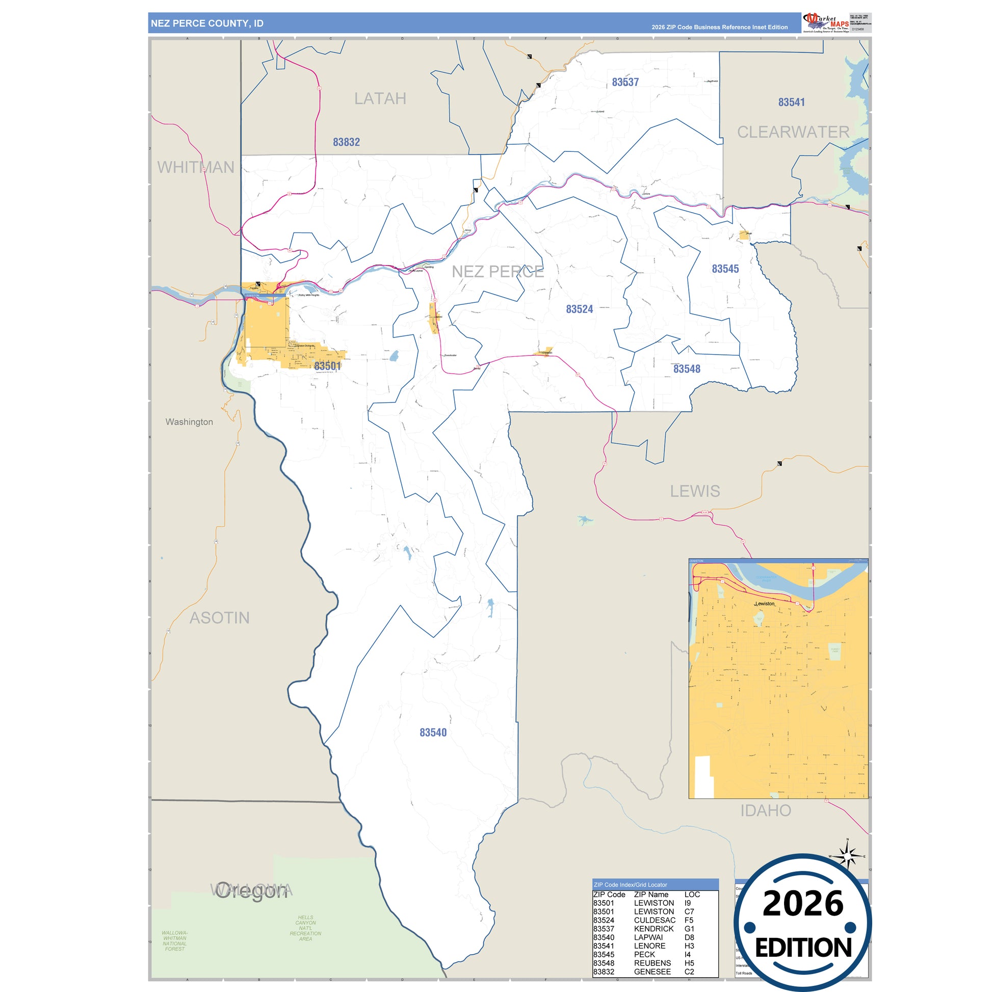 The Business Reference Style Nez Perce County, ID is a detailed map that includes all towns, cities, major roadways, and highways. Available in multiple wall map sizes, perfect for home, school, office, or business display.