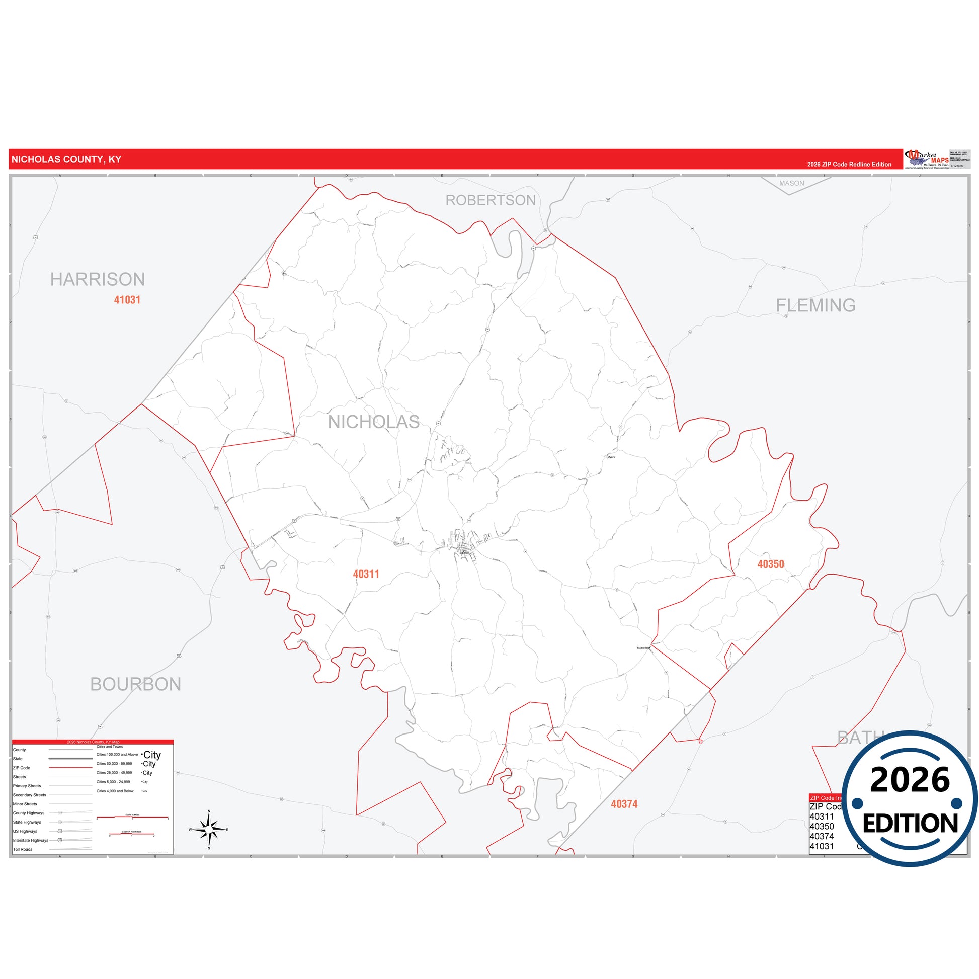 The RedLine Style map of Nicholas County, KY shows ZIP code areas overlaid on a detailed road network of Nicholas County, Kentucky. Ideal for drawing locations, territories, and other applications. Base map features include all major streets and highways labeled, cities and towns, county and state boundaries, neighborhood names, railroads, and a clean white background suitable for marking and planning.