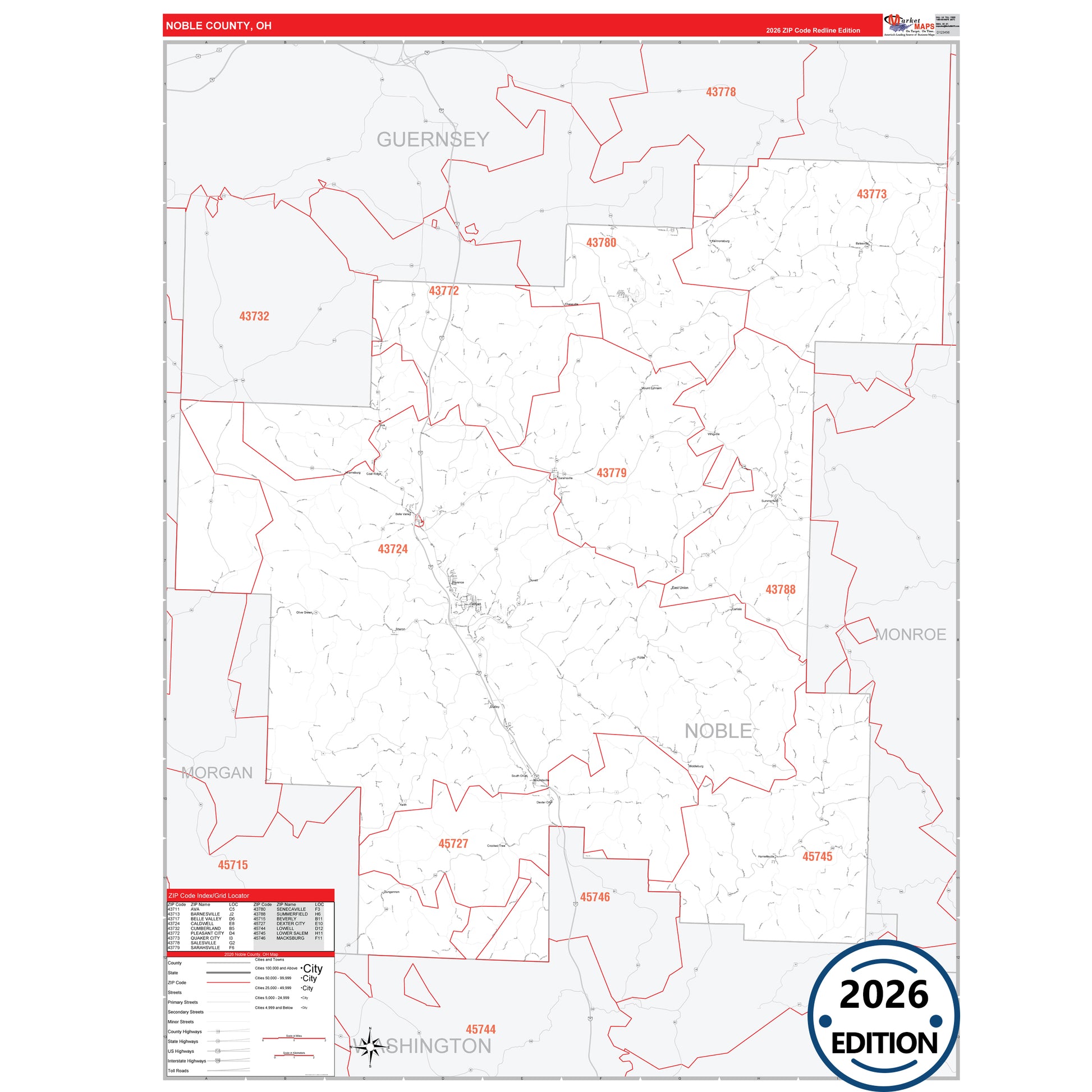 The RedLine Style map of Noble County, OH shows ZIP code areas overlaid on a detailed road network of Noble County, Ohio. Ideal for drawing locations, territories, and other applications. Base map features include all major streets and highways labeled, cities and towns, county and state boundaries, neighborhood names, railroads, and a clean white background suitable for marking and planning.