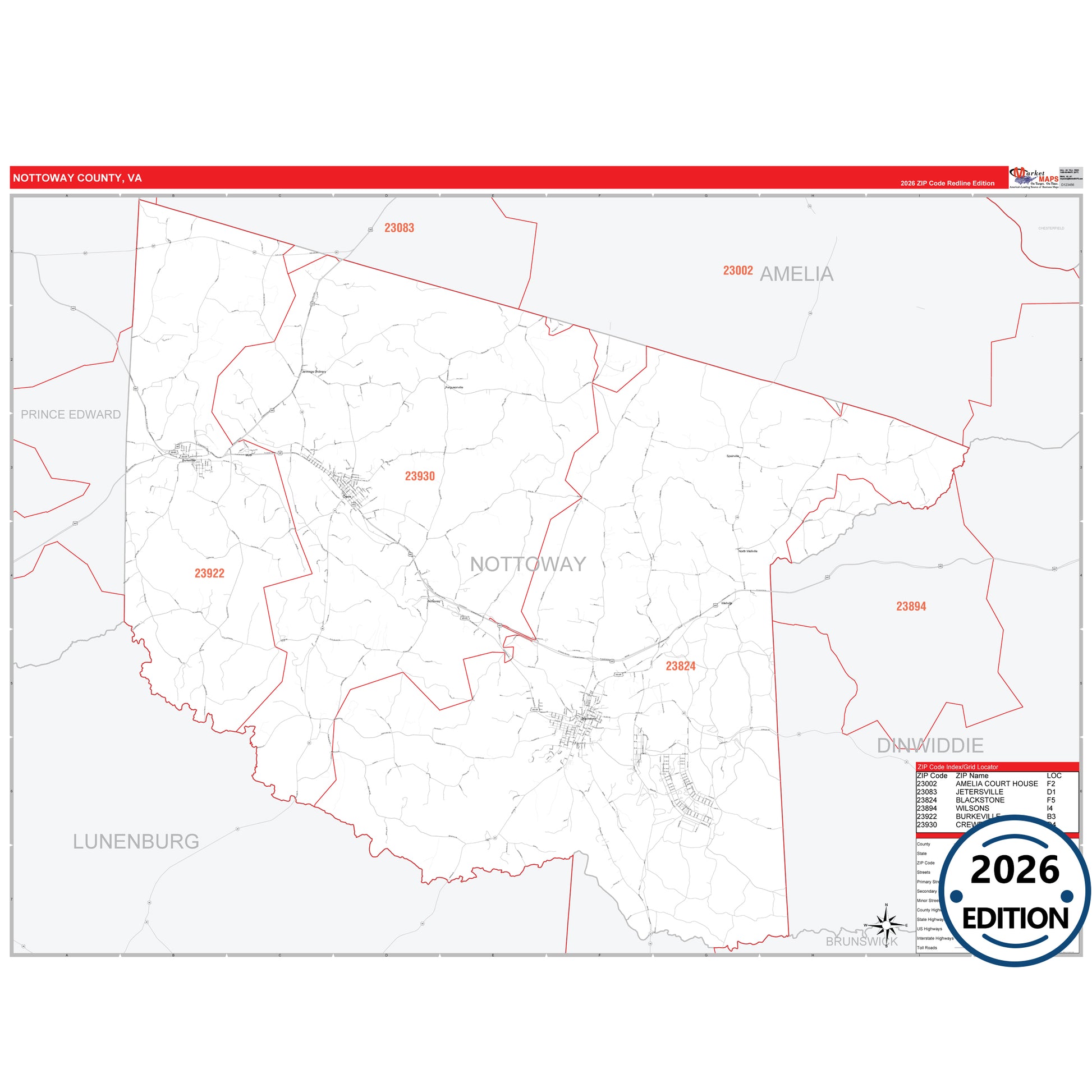 The RedLine Style map of Nottoway County, VA shows ZIP code areas overlaid on a detailed road network of Nottoway County, Virginia. Ideal for drawing locations, territories, and other applications. Base map features include all major streets and highways labeled, cities and towns, county and state boundaries, neighborhood names, railroads, and a clean white background suitable for marking and planning.