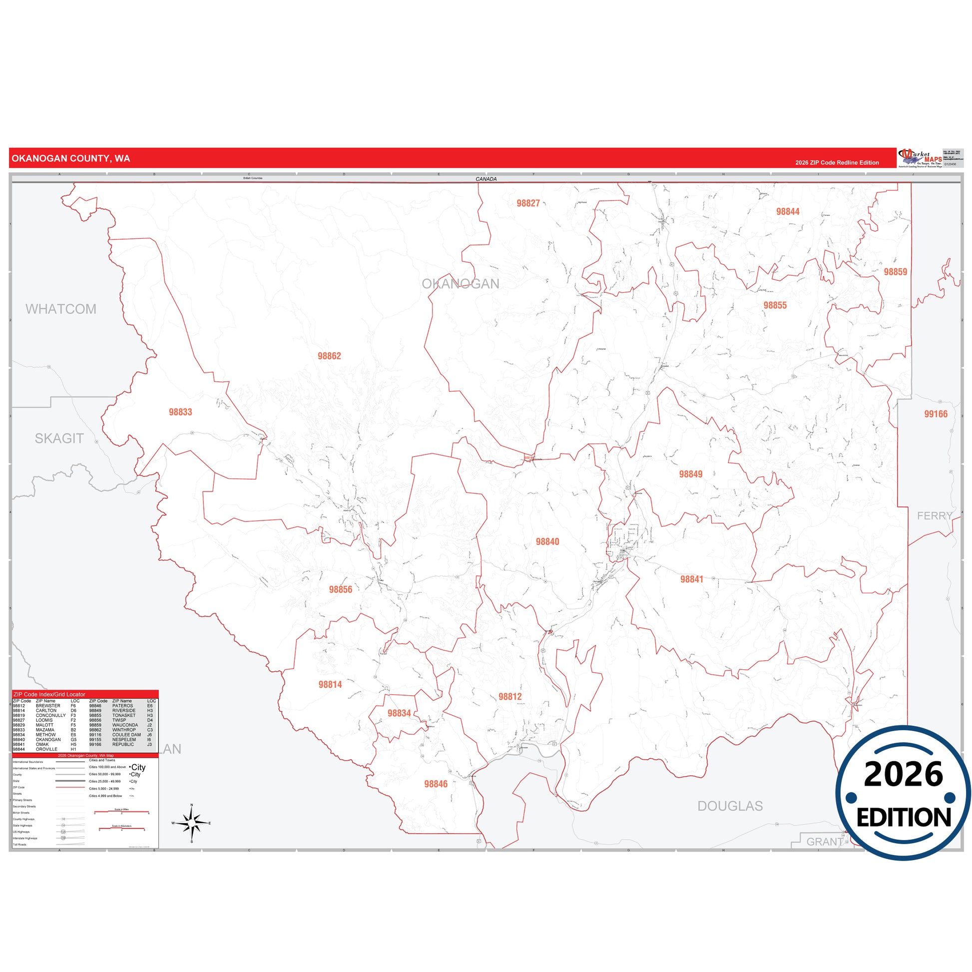 The RedLine Style map of Okanogan County, WA shows ZIP code areas overlaid on a detailed road network of Okanogan County, Washington. Ideal for drawing locations, territories, and other applications. Base map features include all major streets and highways labeled, cities and towns, county and state boundaries, neighborhood names, railroads, and a clean white background suitable for marking and planning.