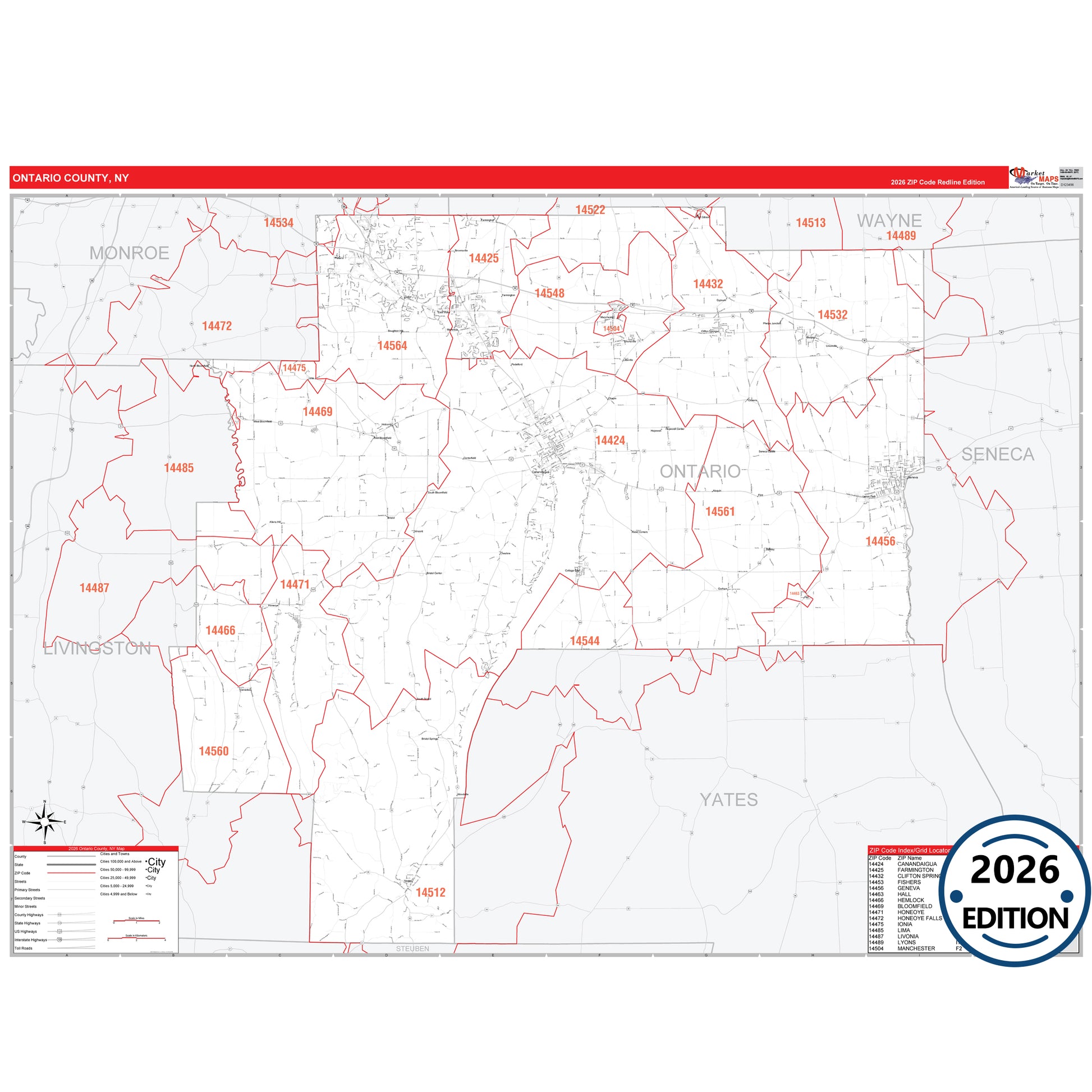 The RedLine Style map of Ontario County, NY shows ZIP code areas overlaid on a detailed road network of Ontario County, New York. Ideal for drawing locations, territories, and other applications. Base map features include all major streets and highways labeled, cities and towns, county and state boundaries, neighborhood names, railroads, and a clean white background suitable for marking and planning.