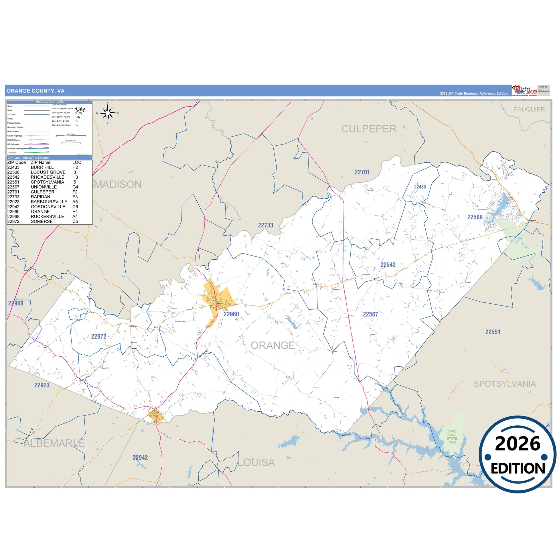 The Business Reference Style Orange County, VA is a detailed map that includes all towns, cities, major roadways, and highways. Available in multiple wall map sizes, perfect for home, school, office, or business display.