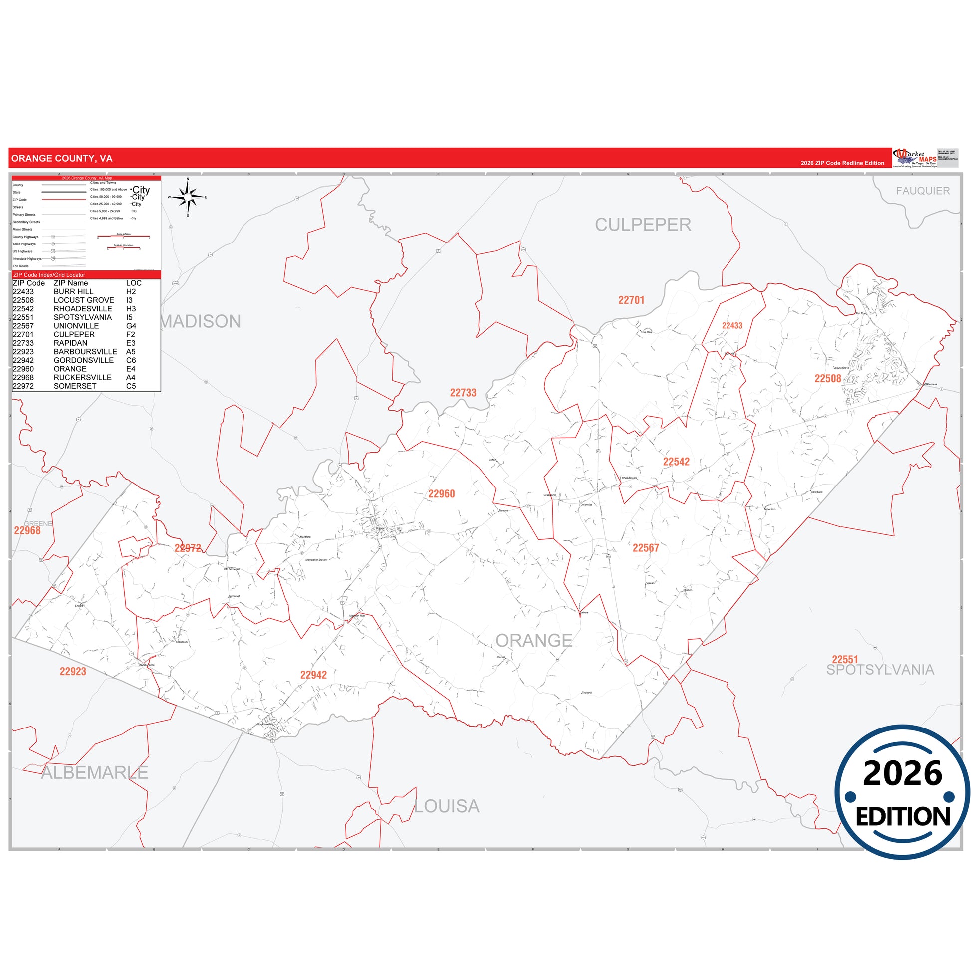 The RedLine Style map of Orange County, VA shows ZIP code areas overlaid on a detailed road network of Orange County, Virginia. Ideal for drawing locations, territories, and other applications. Base map features include all major streets and highways labeled, cities and towns, county and state boundaries, neighborhood names, railroads, and a clean white background suitable for marking and planning.